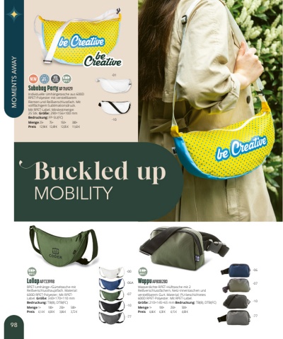 Subobag Party AP716929Individuelle Umh%u00e4ngetasche aus 600D RPET-Polyester mit verstellbarem Riemen und Rei%u00dfverschlussfach. Mit vollfl%u00e4chigem Sublimationsdruck. Mit RPET-Label. Mindestmenge: 25 Stk. Gr%u00f6%u00dfe:290%u00d7156%u00d7100mmBedruckung:FP-SU(FC)Menge25+75+150+300+Preis12,94 %u20ac12,49 %u20ac12,05 %u20ac11,63 %u20acLollap AP733998RPET-Umh%u00e4nge-/G%u00fcrteltasche mit Rei%u00dfverschlusshauptfach. Material: 600D RPET-Polyester. Mit RPETLabel. Gr%u00f6%u00dfe:340%u00d7170%u00d7110mmBedruckung:TB(8), DTB(FC)Menge1+100+250+500+Preis4,14 %u20ac4,00 %u20ac3,86 %u20ac3,72 %u20acWappu AP808280Wasserdichte RPET-H%u00fcfttasche mit 2 Rei%u00dfverschlussf%u00e4chern, Netz-Innentaschen und verstellbarem Gurt. Material: PU-beschichtetes 600D RPET-Polyester. Mit RPET-Label.Gr%u00f6%u00dfe:210%u00d7145%u00d765mm Bedruckung:TB(8), DTB(FC)Menge1+100+250+500+Preis4,46 %u20ac4,30 %u20ac4,15 %u20ac4,00 %u20ac-10-01-00-06A-07-10-77-06-07-10-7798MOMENTS AWAY