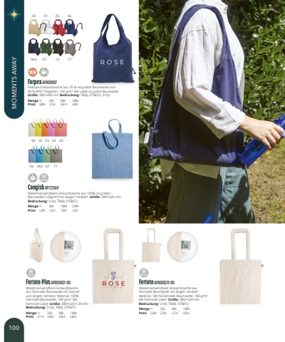 Forpex AP800087Faltbare Einkaufstasche aus 70 % recycelter Baumwolle und 30 % RPET-Polyester, 140g/m%u00b2. Mit Label recycelte Baumwolle.Gr%u00f6%u00dfe:380%u00d7400mm Bedruckung:TB(8), DTB(FC), S1(4)Menge1+250+500+1 000+Preis3,88 %u20ac3,74 %u20ac3,61 %u20ac3,48 %u20acCongish AP721569Wiederverwendbare Einkaufstasche aus 100% recycelter Baumwolle (120g/m%u00b2) mit langen Henkeln. Gr%u00f6%u00dfe:380%u00d7420mmBedruckung:S1(4), TB(8), DTB(FC)Menge1+500+1 000+2 500+Preis1,40 %u20ac1,35 %u20ac1,30 %u20ac1,25 %u20acFertote Plus AP800021-00Wiederverwendbare Einkaufstasche aus Fairtrade-Baumwolle mit Zwickel und langen Henkeln. Material: 100% Fairtrade-Baumwolle, 180g/m%u00b2. Mit Fairtrade-Label. Gr%u00f6%u00dfe:380%u00d7420%u00d7120mmBedruckung:S1(4), TB(8), DTB(FC)Menge1+250+500+1 000+Preis3,11 %u20ac3,00 %u20ac2,90 %u20ac2,80 %u20acFertote AP800020-00Wiederverwendbare Einkaufstasche aus Fairtrade-Baumwolle mit langen Henkeln. Material: 100 % Fairtrade-Baumwolle, 180g/m%u00b2. Mit Fairtrade-Label. Gr%u00f6%u00dfe:380%u00d7420mmBedruckung:S1(4), TB(8), DTB(FC)Menge1+250+500+1 000+Preis2,28 %u20ac2,20 %u20ac2,12 %u20ac2,05 %u20ac-00-06A-01-07-05-10-06-77-00-02-03-04-05-06-06V-07-77140 g/m2180 g/m2120 g/m2100MOMENTS AWAY
