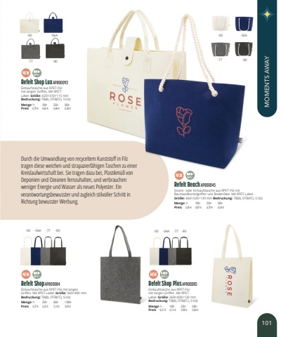 Refelt Shop AP800084Einkaufstasche aus RPET-Filz mit langen Griffen. Mit RPET-Label. Gr%u00f6%u00dfe:360%u00d7400mmBedruckung:TB(8), DTB(FC), S1(4)Menge1+250+500+1 000+Preis3,37 %u20ac3,25 %u20ac3,14 %u20ac3,03 %u20acRefelt Shop Lux AP800093Einkaufstasche aus RPET-Filz mit langen Griffen. Mit RPETLabel. Gr%u00f6%u00dfe:420%u00d7310%u00d7115mmBedruckung:TB(8), DTB(FC), S1(4)Menge1+100+250+500+Preis4,79 %u20ac4,62 %u20ac4,46 %u20ac4,30 %u20acRefelt Beach AP800045Strand- oder Einkaufstasche aus RPET-Filz mit Baumwollkordelgriffen und Bodenfalte. Mit RPET-Label.Gr%u00f6%u00dfe:460%u00d7320%u00d7130mm Bedruckung:TB(8), DTB(FC), S1(4)Menge1+100+250+500+Preis5,05 %u20ac4,87 %u20ac4,70 %u20ac4,54 %u20acRefelt Shop Plus AP800085Einkaufstasche aus RPET-Filz mit langen Griffen. Mit RPETLabel. Gr%u00f6%u00dfe:360%u00d7400%u00d7120mmBedruckung:TB(8), DTB(FC), S1(4)Menge1+100+250+500+Preis4,27 %u20ac4,12 %u20ac3,98 %u20ac3,84 %u20acDurch die Umwandlung von recyceltem Kunststoff in Filz tragen diese weichen und strapazierf%u00e4higen Taschen zu einer Kreislaufwirtschaft bei. Sie tragen dazu bei, Plastikm%u00fcll von Deponien und Ozeanen fernzuhalten, und verbrauchen weniger Energie und Wasser als neues Polyester. Ein verantwortungsbewusster und zugleich stilvoller Schritt in Richtung bewusster Werbung.-00-00-00-00-77-77-77-77-06A-06A-06A-06A-80-80-80-80101MOMENTS AWAY