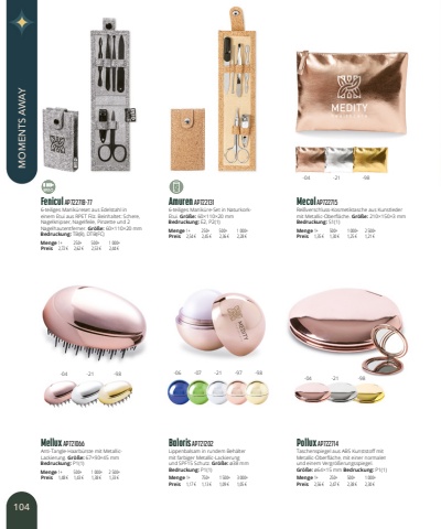 Fenicul AP722718-776-teiliges Manik%u00fcreset aus Edelstahl in einem Etui aus RPET Filz. Beinhaltet: Schere, Nagelknipser, Nagelfeile, Pinzette und 2 Nagelhautentferner. Gr%u00f6%u00dfe:60%u00d7110%u00d720mmBedruckung:TB(8), DTB(FC)Menge1+250+500+1 000+Preis2,72 %u20ac2,62 %u20ac2,53 %u20ac2,44 %u20acMellux AP721066Anti-Tangle-Haarb%u00fcrste mit MetallicLackierung. Gr%u00f6%u00dfe:67%u00d790%u00d745mmBedruckung:P1(1)Menge1+500+1 000+2 500+Preis1,48 %u20ac1,43 %u20ac1,38 %u20ac1,33 %u20acAmuren AP7221316-teiliges Manik%u00fcre-Set in NaturkorkEtui. Gr%u00f6%u00dfe:60%u00d7110%u00d720mmBedruckung:E2, P2(1)Menge1+250+500+1 000+Preis2,54 %u20ac2,45 %u20ac2,36 %u20ac2,28 %u20acBaloris AP721202Lippenbalsam in rundem Beh%u00e4lter mit farbiger Metallic-Lackierung und SPF15 Schutz. Gr%u00f6%u00dfe:%u00f838mmBedruckung:P1(1)Menge1+750+1 500+3 000+Preis1,17 %u20ac1,13 %u20ac1,09 %u20ac1,05 %u20acMecol AP722715Rei%u00dfverschluss-Kosmetiktasche aus Kunstleder mit Metallic-Oberfl%u00e4che. Gr%u00f6%u00dfe:210%u00d7150%u00d73mmBedruckung:S1(1)Menge1+500+1 000+2 500+Preis1,35 %u20ac1,30 %u20ac1,25 %u20ac1,21 %u20acPollux AP722714Taschenspiegel aus ABS Kunststoff mit Metallic-Oberfl%u00e4che, mit einer normalen und einem Vergr%u00f6%u00dferungsspiegel.Gr%u00f6%u00dfe:%u00f864%u00d715mm Bedruckung:P1(1)Menge1+250+500+1 000+Preis2,56 %u20ac2,47 %u20ac2,38 %u20ac2,30 %u20ac-04-04-21-98-06-07-21-97-98-04-21-98-21-98104MOMENTS AWAY
