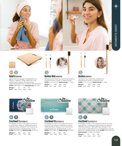 CreaTowel S AP718186-01Zweilagiges Handtuch mit Sublimationsdruck auf einer Seite. Material: 100% Baumwolle & 100% Mikrofaser (400g/m%u00b2). Der Preis ist inkl. Sublimationsdruck. Mindestmenge: 25 Stk.Gr%u00f6%u00dfe:300%u00d7500mm Bedruckung:FP-SU(FC)Menge25+100+250+500+Preis5,56 %u20ac5,37 %u20ac5,18 %u20ac5,00 %u20acBamFit AP864100Digitale Personenwaage mit Wiegefl%u00e4che aus Bambus. Tragkraft: 150kg, Einteilung: 0,1kg, Ma%u00dfeinheiten: kg/lb/st. Mit integriertem, wiederaufladbarem Akku. Inklusive USB-Ladekabel.Gr%u00f6%u00dfe:280%u00d7280%u00d731mm Bedruckung:E3, P3(1)Menge1+50+100+200+Preis20,05 %u20ac19,35 %u20ac18,67 %u20ac18,02 %u20acCreaTowel M AP718206-01Zweilagiges Handtuch mit Sublimationsdruck auf einer Seite. Material: 100% Baumwolle & 100% Mikrofaser (400g/m%u00b2). Der Preis ist inkl. Sublimationsdruck. Mindestmenge: 25 Stk.Gr%u00f6%u00dfe:500%u00d71000mm Bedruckung:FP-SU(FC)Menge25+50+100+200+Preis15,53 %u20ac14,99 %u20ac14,47 %u20ac13,96 %u20acBoohoo Mini AP809568Zahnb%u00fcrste f%u00fcr Kinder aus nat%u00fcrlichem Bambus mit Nylonborsten. Einzeln in Pappschachtel.Gr%u00f6%u00dfe:145%u00d713%u00d75mm Bedruckung:E1, P2(2)Menge1+1 000+3 000+6 000+Preis0,52 %u20ac0,50 %u20ac0,48 %u20ac0,46 %u20acCreaTowel L AP718207-01Zweilagiges Handtuch mit Sublimationsdruck auf einer Seite, gerollt in individuelle Papierbanderole. Material: 100% Baumwolle & 100% Mikrofaser (400g/m%u00b2). Der Preis ist inkl. Sublimationsdruck und Digitaldruck auf der Banderole. Mindestmenge: 25 Stk. Gr%u00f6%u00dfe:700%u00d71400mmBedruckung:FP-SU(FC), FP-DG(FC)Menge25+50+100+200+Preis31,05 %u20ac29,96 %u20ac28,91 %u20ac27,90 %u20acBoohoo AP809567Zahnb%u00fcrste aus nat%u00fcrlichem Bambus mit Nylonborsten. Einzeln in Pappschachtel.Gr%u00f6%u00dfe:175%u00d713%u00d75mm Bedruckung:E1, P2(2)Menge1+1 000+3 000+6 000+Preis0,52 %u20ac0,50 %u20ac0,48 %u20ac0,46 %u20ac-01-01-10-10105MOMENTS AWAY