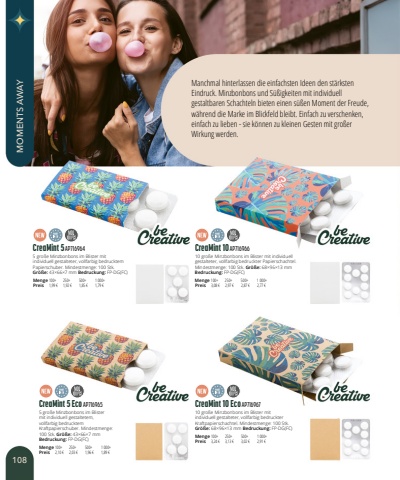 Manchmal hinterlassen die einfachsten Ideen den st%u00e4rksten Eindruck. Minzbonbons und S%u00fc%u00dfigkeiten mit individuell gestaltbaren Schachteln bieten einen s%u00fc%u00dfen Moment der Freude, w%u00e4hrend die Marke im Blickfeld bleibt. Einfach zu verschenken, einfach zu lieben - sie k%u00f6nnen zu kleinen Gesten mit gro%u00dfer Wirkung werden.CreaMint 5 AP7169645 gro%u00dfe Minzbonbons im Blister mit individuell gestalteter, vollfarbig bedrucktem Papierschuber. Mindestmenge: 100 Stk.Gr%u00f6%u00dfe:43%u00d766%u00d77mm Bedruckung:FP-DG(FC)Menge100+250+500+1 000+Preis1,99 %u20ac1,92 %u20ac1,85 %u20ac1,79 %u20acCreaMint 5 Eco AP7169655 gro%u00dfe Minzbonbons im Blister mit individuell gestaltetem, vollfarbig bedrucktem Kraftpapierschuber. Mindestmenge: 100 Stk. Gr%u00f6%u00dfe:43%u00d766%u00d77mmBedruckung:FP-DG(FC)Menge100+250+500+1 000+Preis2,10 %u20ac2,03 %u20ac1,96 %u20ac1,89 %u20acCreaMint 10 AP71696610 gro%u00dfe Minzbonbons im Blister mit individuell gestalteter, vollfarbig bedruckter Papierschachtel. Mindestmenge: 100 Stk. Gr%u00f6%u00dfe:68%u00d796%u00d713mmBedruckung:FP-DG(FC)Menge100+250+500+1 000+Preis3,08 %u20ac2,97 %u20ac2,87 %u20ac2,77 %u20acCreaMint 10 Eco AP71696710 gro%u00dfe Minzbonbons im Blister mit individuell gestalteter, vollfarbig bedruckter Kraftpapierschachtel. Mindestmenge: 100 Stk.Gr%u00f6%u00dfe:68%u00d796%u00d713mm Bedruckung:FP-DG(FC)Menge100+250+500+1 000+Preis3,24 %u20ac3,13 %u20ac3,02 %u20ac2,91 %u20ac108MOMENTS AWAY