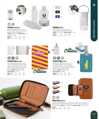 Cosmair AP800184-01Reise-Kosmetikflaschensetmit 3 PETBeh%u00e4ltern (je 40ml) in einer Halterung aus recyceltem ABS-Kunststoff.Gr%u00f6%u00dfe:%u00f851%u00d789mm Bedruckung:P1(4), UVB(FC), DO4(FC)Menge1+250+500+1 000+Preis1,94 %u20ac1,87 %u20ac1,80 %u20ac1,74 %u20acPulux Pass AP800178Luxuri%u00f6ser Reiseorganizer und Passh%u00fclle aus recyceltem PU-Leder mit Rei%u00dfverschluss. Mit mehreren Innentaschen f%u00fcr Dokumente, Karten und Reiseutensilien. Gr%u00f6%u00dfe:120%u00d7185%u00d735mm Bedruckung:TC(8), DTC(FC)Menge1+50+100+200+Preis19,41 %u20ac18,73 %u20ac18,07 %u20ac17,44 %u20acCreaFelt Tag AP716679Individueller Koffergurt aus RPET-Filz mit vollfarbig bedruckter Vorderseite, Schnallenverschluss und Papiereinleger. Der Preis beinhaltet den Sublimationsdruck. Mit RPET-Label. Mindestmenge: 50 Stk. Gr%u00f6%u00dfe:200%u00d765%u00d77mmBedruckung:FP-SU(FC)Menge50+100+250+500+Preis4,92 %u20ac4,75 %u20ac4,58 %u20ac4,42 %u20acOrlando AP808121Kofferanh%u00e4nger mit Flugzeugmotiv aus Aluminium und Schnur aus Metall.Gr%u00f6%u00dfe:75%u00d746%u00d73mm Bedruckung:E1, P2(2)Menge1+750+1 500+3 000+Preis1,24 %u20ac1,20 %u20ac1,16 %u20ac1,12 %u20acCreaFelt Pass AP716681Individuelle Reisepassh%u00fclle aus RPETFilz mit vollfarbig bedrucktem Einband und Druckknopfverschluss. Der Preis beinhaltet den Sublimationsdruck. Mit RPET-Label. Mindestbestellmenge: 50 Stk. Gr%u00f6%u00dfe:105%u00d7145%u00d712mmBedruckung:FP-SU(FC)Menge50+100+250+500+Preis4,46 %u20ac4,30 %u20ac4,15 %u20ac4,00 %u20ac-21-10-10-09-06-06111MOMENTS AWAY