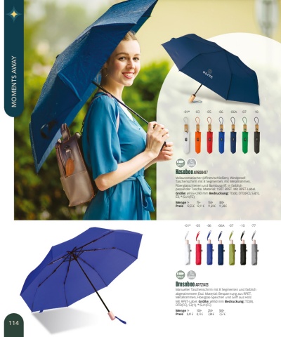 Kasaboo AP808417Vollautomatischer (%u00f6ffnen/schlie%u00dfen), WindproofTaschenschirm mit 8 Segmenten, mit Metallrahmen, Fiberglasschienen und Bambusgriff. In farblich passender Tasche. Material: 190T RPET. Mit RPET-Label.Gr%u00f6%u00dfe:%u00f8955%u00d7290mm Bedruckung:TD(8), DTD(FC), S3(1), E3, *:SU1(FC)Menge1+75+150+300+Preis12,55 %u20ac12,11 %u20ac11,69 %u20ac11,28 %u20acBrosoboo AP721413Manueller Taschenschirm mit 8 Segmenten und farblich abgestimmtem Etui. Material: Bespannung aus RPET, Metallrahmen, Fiberglas-Speichen und Griff aus Holz. Mit RPET-Label. Gr%u00f6%u00dfe:%u00f8950mm Bedruckung:TD(8), DTD(FC), S3(1), *:SU1(FC)Menge1+100+250+500+Preis8,41 %u20ac8,12 %u20ac7,84 %u20ac7,57 %u20ac-01*-01*-05-06-06A-07-10-77-03-05-06-06A-07-10114MOMENTS AWAY