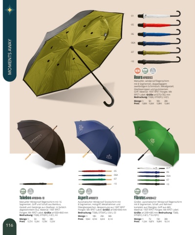 Raura AP800103Manueller, windproof Regenschirm mit 8 Segmenten, doppellagigem zweifarbigem Schirmdach, Metallgestell, Glasfaserrippen und gummiertem Griff. Material: 190T RPET Pongee. Mit RPET-Label. Gr%u00f6%u00dfe:%u00f81075%u00d7765mmBedruckung:TD(8), DTD(FC), S3(1)Menge1+50+100+200+Preis13,84 %u20ac13,36 %u20ac12,89 %u20ac12,44 %u20acFibratus AP808422Gro%u00dfer, automatischer Windproof-Regenschirm mit 8 Segmenten, Schaft und Rahmen komplett aus Fiberglas, Griff aus ABS. Material: 190T RPET-Pongee. Mit RPET-Label.Gr%u00f6%u00dfe:%u00f81200%u00d7685mm Bedruckung:TD(8), DTD(FC), S3(1), *:SU1(FC)Menge1+75+150+300+Preis11,26 %u20ac10,87 %u20ac10,49 %u20ac10,12 %u20acAsperit AP800731Automatischer Windproof-Stockschirm mit 8 Segmenten, Holzgriff, Metallrahmen und Fiberglasspeichen. Bespannung aus 190T RPET Pongee. Mit RPET-Label. Gr%u00f6%u00dfe:%u00f81040%u00d7840mmBedruckung:TD(8), DTD(FC), S3(1), E3Menge1+100+250+500+Preis9,06 %u20ac8,74 %u20ac8,43 %u20ac8,13 %u20acTakeboo AP808416-10Manueller Windproof-Regenschirm mit 16 Segmenten, Griff und Schaft aus Bambus, Gestell und Gest%u00e4nge aus Glasfaser. In farblich abgestimmtem Etui. Material: 190T RPETPongee. Mit RPET-Label. Gr%u00f6%u00dfe:%u00f81050%u00d7860mmBedruckung:TD(8), DTD(FC), S3(1), E3Menge1+50+100+200+Preis13,72 %u20ac13,24 %u20ac12,78 %u20ac12,33 %u20ac-01-05-06-06A-07-05-06A-07-10-01*-06-06A-07-10-10116MOMENTS AWAY