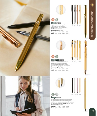 Oronos AP800109Kugelschreiber aus recyceltem Aluminium mit gl%u00e4nzendem Metallic-Finish, blauschreibend.Gr%u00f6%u00dfe:%u00f810%u00d7135mmBedruckung:E0, P1(2)Menge1+1 000+3 000+6 000+Preis0,74 %u20ac0,71 %u20ac0,69 %u20ac0,67 %u20acTonnel Boo AP800180Bambus-Kugelschreiber mit Stylus, gl%u00e4nzenden Metallic-Details und farblich passendem Touch-Stylus, blauschreibend. Gr%u00f6%u00dfe:%u00f810%u00d7150mmBedruckung:E1, P1(4)Menge1+1 000+3 000+6 000+Preis0,75 %u20ac0,72 %u20ac0,69 %u20ac0,67 %u20acRangle AP808168Tintenloser Stift aus Aluminium mit Spitze aus einer Metalllegierung, die das Papier oxidiert. Der Stift schreibt wie ein Bleistift und ist ebenfalls radierbar. Gr%u00f6%u00dfe:%u00f88%u00d7151mmBedruckung:E0, P1(4)Menge1+500+1 000+2 500+Preis1,46 %u20ac1,41 %u20ac1,36 %u20ac1,31 %u20ac-10-10-80-21-97-97-98-98AL-10-21-97-98INKLESSAL123PRODUCTIVE SOLUTIONS
