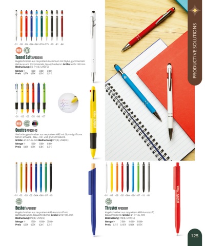 Basher AP808187Kugelschreiber aus recyceltem ABS-Kunststoff mit Bambusdr%u00fccker, blauschreibend. Gr%u00f6%u00dfe:%u00f810%u00d7145mmBedruckung:P0(4), UVA(FC)Menge1+2 500+10 000+20 000+Preis0,26 %u20ac0,25 %u20ac0,24 %u20ac0,23 %u20acQuattro AP800140Vierfarbkugelschreiber aus recyceltem ABS mit Gummigriffzone. Minen schwarz-, blau-, rot- und gr%u00fcnschreibend.Gr%u00f6%u00dfe:%u00f813%u00d7145mm Bedruckung:P1(4), UVB(FC)Menge1+1 000+3 000+6 000+Preis0,40 %u20ac0,39 %u20ac0,38 %u20ac0,37 %u20acTonnel Soft AP800148Kugelschreiber aus recyceltem Aluminium mit Stylus, gummiertem Geh%u00e4use und Chromdetails, blauschreibend. Gr%u00f6%u00dfe:%u00f810%u00d7140mmBedruckung:E0, P1(4), UVB(FC)Menge1+1 000+3 000+6 000+Preis0,57 %u20ac0,55 %u20ac0,53 %u20ac0,51 %u20acThruster AP808189Kugelschreiber aus recyceltem ABS-Kunststoff, blauschreibend. Gr%u00f6%u00dfe:%u00f811%u00d7136mmBedruckung:P0(4), UVA(FC)Menge1+2 500+10 000+20 000+Preis0,15 %u20ac0,145 %u20ac0,140 %u20ac0,135 %u20ac-01-02-03-05-06-07-01-02-03-05-06A-06V-07-10-01-02-03-05-06A-06V-07-10-81-01-03-05-06A-06V-07A-07V-10-81-84AL125PRODUCTIVE SOLUTIONS