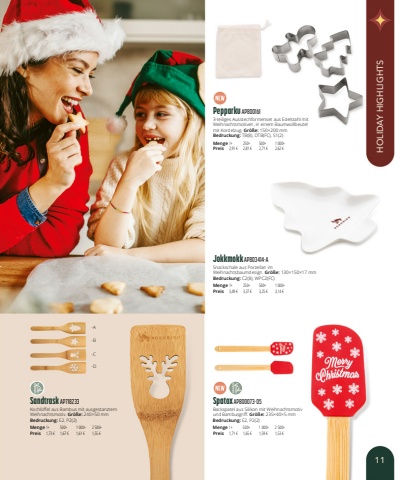 Sandtrask AP718233Kochl%u00f6ffel aus Bambus mit ausgestanztem Weihnachtsmotiv. Gr%u00f6%u00dfe:240%u00d750mmBedruckung:E2, P2(2)Menge1+500+1 000+2 500+Preis1,73 %u20ac1,67 %u20ac1,61 %u20ac1,55 %u20acSpatox AP800073-05Backspatel aus Silikon mit Weihnachtsmotiv und Bambusgriff. Gr%u00f6%u00dfe:235%u00d740%u00d75mmBedruckung:E2, P2(2)Menge1+500+1 000+2 500+Preis1,71 %u20ac1,65 %u20ac1,59 %u20ac1,53 %u20acJokkmokk AP803414-ASnackschale aus Porzellan im Weihnachtsbaumdesign. Gr%u00f6%u00dfe:130%u00d7150%u00d717mmBedruckung:C2(8), WPC2(FC)Menge1+250+500+1 000+Preis3,49 %u20ac3,37 %u20ac3,25 %u20ac3,14 %u20acPepparku AP8001613-teiliges Ausstechformenset aus Edelstahl mit Weihnachtsmotiven, in einem Baumwollbeutel mit Kordelzug. Gr%u00f6%u00dfe:150%u00d7200mmBedruckung:TB(8), DTB(FC), S1(2)Menge1+250+500+1 000+Preis2,91 %u20ac2,81 %u20ac2,71 %u20ac2,62 %u20ac-A-B-C-D11HOLIDAY HIGHLIGHTS