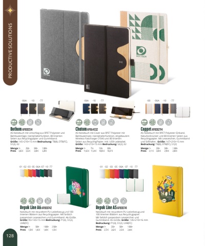 Bothom AP800514A5 Notizbuch mit Umschlag aus RPET Polyester und Bambuseinlage, Handyhalterfunktion, 80 linierten Seiten aus Recyclingpapier und Gummiband.Gr%u00f6%u00dfe:145%u00d7210%u00d715mm Bedruckung:TB(8), DTB(FC), S1(2), E2Menge1+250+500+1 000+Preis3,65 %u20ac3,52 %u20ac3,40 %u20ac3,28 %u20acRepuk Line A6 AP800742Notizbuch mit recyceltem PU-Lederbezug und 100 linierten Bl%u00e4ttern aus Recyclingpapier. Mit farblich passendem Lesezeichen und Gummiband. A6-Gr%u00f6%u00dfe.Gr%u00f6%u00dfe:95%u00d7145%u00d715mm Bedruckung:P1(4), S1(2), UVB(FC)Menge1+500+1 000+2 500+Preis1,50 %u20ac1,45 %u20ac1,40 %u20ac1,35 %u20acRepuk Line A5 AP800741Notizbuch mit recyceltem PU-Lederbezug und 100 linierten Bl%u00e4ttern aus Recyclingpapier. Mit farblich passendem Lesezeichen und Gummiband. A5-Gr%u00f6%u00dfe. Gr%u00f6%u00dfe:145%u00d7210%u00d716mmBedruckung:P1(4), S1(2), UVB(FC)Menge1+250+500+1 000+Preis2,72 %u20ac2,62 %u20ac2,53 %u20ac2,44 %u20acChatom AP864032A5 Notizbuch mit Cover aus RPET Polyester mit Bambuseinsatz, Handyhalterfunktion, eingebautem Wireless-Fastcharger (15W) und 80 linierten Seiten aus RecyclingPapier. Inkl. USB-Ladekabel.Gr%u00f6%u00dfe:143%u00d7213%u00d715mm Bedruckung:S2(2), E2Menge1+75+150+300+Preis11,65 %u20ac11,24 %u20ac10,85 %u20ac10,47 %u20acCoppet AP808294A5 Notizbuch mit RPET-Polyester-Einband, Naturkorkr%u00fccken und 80 linierten Seiten aus Recyclingpapier. Mit Lesezeichen, Gummiband und Stifthalter. Gr%u00f6%u00dfe:147%u00d7210%u00d715mmBedruckung:TB(8), DTB(FC), S1(2)Menge1+250+500+1 000+Preis3,11 %u20ac3,00 %u20ac2,90 %u20ac2,80 %u20ac-06A-01-02-03-05-06A-07-10-77-01-02-03-05-06A-07-10-77-10-77-06A-10-77-00-06A-10-77128PRODUCTIVE SOLUTIONS