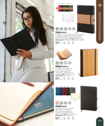 Gracilis AP800079A5 Notizbuch mit Cover aus 300D RPET Polyester mit 80 blanko Seiten und farblich abgestimten Gummiband, Lesezeichen sowie Stifteschlaufe. Gr%u00f6%u00dfe:145%u00d7210%u00d710mmBedruckung:TB(8), DTB(FC), S1(2)Menge1+250+500+1 000+Preis3,17 %u20ac3,06 %u20ac2,95 %u20ac2,85 %u20acPathom AP806992-10A5-Notizbuch mit Bambus- und Kunstledercover mit 80 Seiten (liniert) aus Recyclingpapier, Lesezeichen und Kautschukband. A5-Gr%u00f6%u00dfe. Gr%u00f6%u00dfe:140%u00d7210%u00d715mmBedruckung:E2, P2(4), S1(1)Menge1+100+250+500+Preis4,92 %u20ac4,75 %u20ac4,58 %u20ac4,42 %u20acCorpux AP800780A5 Notizbuch mit Umschlag aus nat%u00fcrlichem Kork und Kunstleder mit farblich abgestimmten Lesezeichen, Gummiband und Stifteschlaufe sowie 80 linierten Seiten aus Recyclingpapier. Gr%u00f6%u00dfe:145%u00d7210%u00d715mmBedruckung:E2, P1(4), S1(2), TB(8), DTB(FC), UVB(FC)Menge1+250+500+1 000+Preis3,11 %u20ac3,00 %u20ac2,90 %u20ac2,80 %u20ac-06-06A-08-10-77-01-05-06A-07-10-77129PRODUCTIVE SOLUTIONS