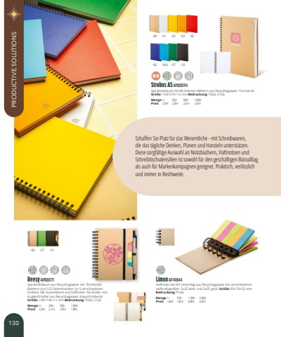 Strobus A5 AP800194Spiralnotizbuch mit 80 linierten Bl%u00e4ttern aus Recyclingpapier. Format A5.Gr%u00f6%u00dfe:150%u00d7215%u00d712mm Bedruckung:P2(4), S1(2)Menge1+250+500+1 000+Preis2,59 %u20ac2,50 %u20ac2,41 %u20ac2,33 %u20acReesy AP800771Spiralnotizbuch aus Recyclingpapier mit 70 linierten Bl%u00e4ttern und 125 Seitenmarkern (in 5 verschiedenen Farben). Mit Gummiband und Stifthalter. A6-Gr%u00f6%u00dfe. Inkl. Kugelschreiber aus Recyclingpapier, blauschreibend.Gr%u00f6%u00dfe:130%u00d7145%u00d711mm Bedruckung:P2(4), S1(2)Menge1+250+500+1 000+Preis2,20 %u20ac2,12 %u20ac2,05 %u20ac1,98 %u20acLimon AP741844Haftnotiz-Set mit Umschlag aus Recyclingpapier mit verschiedenen Haftnotizgr%u00f6%u00dfen: 5x25 klein und 3x25 gro%u00df. Gr%u00f6%u00dfe:83%u00d776%u00d722mmBedruckung:P1(4)Menge1+750+1 500+3 000+Preis1,06 %u20ac1,02 %u20ac0,98 %u20ac0,95 %u20acSchaffen Sie Platz f%u00fcr das Wesentliche - mit Schreibwaren, die das t%u00e4gliche Denken, Planen und Handeln unterst%u00fctzen. Diese sorgf%u00e4ltige Auswahl an Notizb%u00fcchern, Haftnotizen und Schreibtischutensilien ist sowohl f%u00fcr den gesch%u00e4ftigen B%u00fcroalltag als auch f%u00fcr Markenkampagnen geeignet. Praktisch, verl%u00e4sslich und immer in Reichweite.-00-00-06-07-01-06V-03-10-10-02-07-05130PRODUCTIVE SOLUTIONS