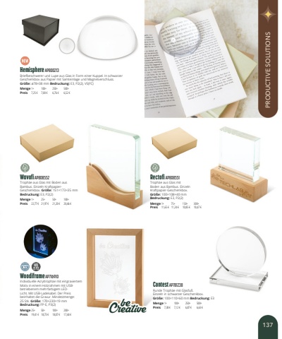 Woodiframe AP716910Individuelle Acryltroph%u00e4e mit eingraviertem Motiv in einem Holzrahmen mit USBbetriebenem mehrfarbigem LEDLicht. Mit USB-Ladekabel. Der Preis beinhaltet die Gravur. Mindestmenge: 25 Stk. Gr%u00f6%u00dfe:170%u00d7230%u00d719mmBedruckung:FP-E, P3(2)Menge25+50+100+200+Preis19,41 %u20ac18,73 %u20ac18,07 %u20ac17,44 %u20acWavofi AP808552Troph%u00e4e aus Glas mit Boden aus Bambus. Einzeln KraftpapierGeschenkbox. Gr%u00f6%u00dfe:151%u00d7173%u00d735mmBedruckung:E3, P2(2)Menge1+25+50+100+Preis22,77 %u20ac21,97 %u20ac21,20 %u20ac20,46 %u20acHemisphere AP800213Briefbeschwerer und Lupe aus Glas in Form einer Kuppel. In schwarzer Geschenkbox aus Papier mit Samteinlage und Magnetverschluss.Gr%u00f6%u00dfe:%u00f878%u00d738mm Bedruckung:E3, P2(2), VS(FC)Menge1+100+250+500+Preis7,25 %u20ac7,00 %u20ac6,76 %u20ac6,52 %u20acContest AP781238Runde Troph%u00e4e mit Glasfu%u00df. Einzeln in schwarzer Geschenkbox.Gr%u00f6%u00dfe:100%u00d7110%u00d760mm Bedruckung:E3Menge1+100+250+500+Preis7,38 %u20ac7,12 %u20ac6,87 %u20ac6,63 %u20acRectofi AP808551Troph%u00e4e aus Glas mit Boden aus Bambus. Einzeln Kraftpapier-Geschenkbox.Gr%u00f6%u00dfe:100%u00d7108%u00d740mmBedruckung:E3, P2(2)Menge1+75+150+300+Preis11,65 %u20ac11,24 %u20ac10,85 %u20ac10,47 %u20ac137PRODUCTIVE SOLUTIONS