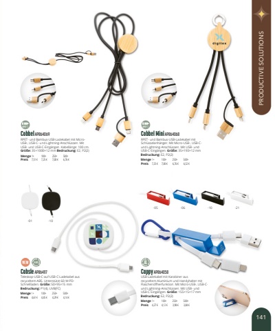 Cobbel AP864069RPET- und Bambus-USB-Ladekabel mit MicroUSB-, USB-C- und Lightning-Anschl%u00fcssen. Mit USB- und USB-C-Eing%u00e4ngen. Kabell%u00e4nge: 100cm.Gr%u00f6%u00dfe:35%u00d71000%u00d712mm Bedruckung:E2, P2(2)Menge1+100+250+500+Preis7,51 %u20ac7,25 %u20ac7,00 %u20ac6,76 %u20acCobbel Mini AP864068RPET- und Bambus-USB-Ladekabel mit Schl%u00fcsselanh%u00e4nger. Mit Micro-USB-, USB-Cund Lightning-Anschl%u00fcssen. Mit USB- und USB-C-Eing%u00e4ngen. Gr%u00f6%u00dfe:35%u00d7190%u00d712mmBedruckung:E2, P2(2)Menge1+100+250+500+Preis7,25 %u20ac7,00 %u20ac6,76 %u20ac6,52 %u20acCappy AP864058USB-Ladekabel mit Karabiner aus recyceltem Aluminium und Handyhalter mit Flaschen%u00f6ffnerfunktion. Mit Micro-USB-, USB-Cund Lightning-Anschl%u00fcssen. Mit USB- und USB-C-Eing%u00e4ngen. Gr%u00f6%u00dfe:155%u00d715%u00d717mmBedruckung:E2, P2(2)Menge1+100+250+500+Preis4,27 %u20ac4,12 %u20ac3,98 %u20ac3,84 %u20acCabsle AP864117Teleskop-USB-C-auf-USB-C-Ladekabel aus recyceltem ABS. Unterst%u00fctzt 60-W-PDSchnellladen. Gr%u00f6%u00dfe:50%u00d795%u00d715mmBedruckung:P1(4), UVB(FC)Menge1+100+250+500+Preis4,61 %u20ac4,45 %u20ac4,29 %u20ac4,14 %u20ac-05-06-10-01-10-21AL141PRODUCTIVE SOLUTIONS
