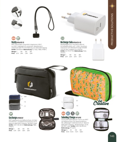 Gocharge AP808307RPET-Kabeltasche mit Rei%u00dfverschluss, mit NetzInnenf%u00e4chern und Rei%u00dfverschlusstasche vorne. Material: 600D RPET-Polyester. Mit RPET-Label.Gr%u00f6%u00dfe:220%u00d7130%u00d740mm Bedruckung:TB(8), DTB(FC)Menge1+100+250+500+Preis5,18 %u20ac5,00 %u20ac4,83 %u20ac4,66 %u20acSuboBag Charge AP716918Individuelle Kabelorganizer-Tasche aus RPET mit Rei%u00dfverschluss und Netzinnenf%u00e4chern. Mit vollfl%u00e4chigem Sublimationsdruck. Material: 600D RPET-Polyester. Mindestmenge: 25 Stk. Mit RPET-Label. Gr%u00f6%u00dfe:220%u00d7130%u00d740mmBedruckung:FP-SU(FC)Menge25+50+100+200+Preis18,76 %u20ac18,10 %u20ac17,47 %u20ac16,86 %u20ac-06A-10-77Fastly AP864118-10RPET Handyhalter-Lanyardmit integriertem USB-Czu-USB-C-Ladekabel mit versteckten Metallsteckern. Unterst%u00fctzt 60W PD-Schnellladung und Daten%u00fcbertragung.Gr%u00f6%u00dfe:58%u00d7850mm Bedruckung:E2, P2(2), TB(8), DTB(FC)Menge1+100+250+500+Preis6,21 %u20ac5,99 %u20ac5,78 %u20ac5,58 %u20acRecharge Solo AP864054-01Wandladeger%u00e4t aus recyceltem ABS mit Schnellladefunktion und 1 USB-C-Anschluss. Unterst%u00fctzt Schnellladetechnologie (PD20W / QC3.0). Mit 2-poligem Euro-Stecker.Gr%u00f6%u00dfe:42%u00d779%u00d727mm Bedruckung:P2(4), UVC(FC)Menge1+100+250+500+Preis6,47 %u20ac6,24 %u20ac6,02 %u20ac5,81 %u20ac-10-01143PRODUCTIVE SOLUTIONS