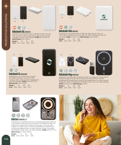 RaluSee AP864073-21Powerbank aus recyceltem Aluminium mit halbtransparentem Geh%u00e4use und sichtbaren elektronischen Komponenten. Mit 5000-mAh-Akku und integriertem magnetischen Wireless-Fast-Charger (15 W). Mit USB-CEingang und Ladeanschluss. Inklusive selbstklebendem Metallring zur Nutzung der Magnetfunktion an jedem Wireless-Charger. Kompatibel mit iPhone%u00ae 12 oder neuer. Inkl. USB-Ladekabel. Gr%u00f6%u00dfe:63%u00d794%u00d712mmBedruckung:E3, P3(4), UVD(FC)Menge1+25+50+100+Preis25,36 %u20ac24,47 %u20ac23,61 %u20ac22,78 %u20acRabobank Mag AP864064Powerbank recyceltem ABS mit 5000-mAh-Akku und integriertem magnetischen Wireless-Charger (5 W). Mit USB-C-Eingang und Ladeanschluss. Inklusive selbstklebendem Metallring zur Nutzung der Magnetfunktion an jedem kabellos aufladbaren Ger%u00e4t. Kompatibel mit iPhone%u00ae 12 oder neuer. Inkl. USB-Ladekabel.Gr%u00f6%u00dfe:64%u00d798%u00d716mm Bedruckung:UVD(FC)Menge1+50+100+200+Preis13,97 %u20ac13,48 %u20ac13,01 %u20ac12,55 %u20acRabobank XL AP864049Powerbank aus recyceltem ABS Kunststoff mit 10000mAh Akku, 2 USB und 1 USB-C Ladeports, Mikro USB und USB-C Eingangsports. Inkl. USB-Ladekabel. Gr%u00f6%u00dfe:70%u00d7136%u00d716mmBedruckung:P3(4), UVD(FC)Menge1+50+100+200+Preis16,82 %u20ac16,23 %u20ac15,66 %u20ac15,11 %u20acRabobank XXL AP864113Powerbank aus recyceltem ABS mit 20000mAh Akku. Mit zwei USB- und einem USB-C-Ladeanschluss. Micro-USB- und USBC-Eingang. Inklusive USB-Ladekabel. Gr%u00f6%u00dfe:68%u00d7138%u00d728mmBedruckung:P3(4), UVD(FC)Menge1+25+50+100+Preis27,17 %u20ac26,22 %u20ac25,30 %u20ac24,41 %u20acRabobank Slim AP864115Powerbank aus recyceltem ABS mit 5000mAh Akku. Mit zwei USB- und einem USB-C-Ladeanschluss. Micro-USB- und USB-C-Eingang. Inklusive USBLadekabel. Gr%u00f6%u00dfe:64%u00d793%u00d714mm Bedruckung:P3(4), UVD(FC)Menge1+75+150+300+Preis11,00 %u20ac10,62 %u20ac10,25 %u20ac9,89 %u20ac-01-10-01-01-10-10-01-105000 mAh20000 mAh10000 mAh5000 mAhAL5000 mAh146PRODUCTIVE SOLUTIONS