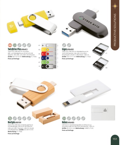 BooSpin AP897091Dreh OTG USB-Stick im Bambusgeh%u00e4use mit Metallb%u00fcgel, 4/8/16/32 GB Speicher, USB und USB-C Steckern, USB 2.0. Einzeln in Kraftpapierbox. Gr%u00f6%u00dfe:65%u00d720%u00d710mmBedruckung:E1, P2(4)Preis auf AnfrageRabax AP864085USB-Stick in Kreditkartengr%u00f6%u00dfe im Geh%u00e4use aus recyceltem ABS mit 4/8/16/32 GB Speicher. USB 2.0.Gr%u00f6%u00dfe:85%u00d755%u00d73mm Bedruckung:UVB(FC), P1(2)Preis auf AnfrageGigax AP864083Twist OTG USB-Stick im Metallgeh%u00e4use mit 16/32 GB Speicher. Mit USB- und USB-CAnschl%u00fcssen. Einzeln in Blechdose. USB 2.0.Gr%u00f6%u00dfe:70%u00d717%u00d711mm Bedruckung:E1, P2(2)Preis auf AnfrageTwistDrive Plus AP864123Twist OTG USB-Stick im recycelten ABS- und Metallgeh%u00e4use mit 8/16/32 GB Speicher. Mit USB- und USB-C-Anschl%u00fcssen.Gr%u00f6%u00dfe:66%u00d719%u00d710mm Bedruckung:E1, P2(4)Preis auf Anfrage-21-80-01-02-05-06-07-10151PRODUCTIVE SOLUTIONS