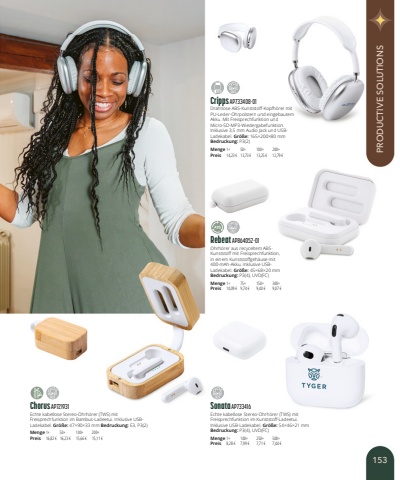 Chorus AP721931Echte kabellose Stereo-Ohrh%u00f6rer (TWS) mit Freisprechfunktion im Bambus-Ladeetui. Inklusive USBLadekabel. Gr%u00f6%u00dfe:47%u00d790%u00d733mm Bedruckung:E3, P3(2)Menge1+50+100+200+Preis16,82 %u20ac16,23 %u20ac15,66 %u20ac15,11 %u20acSonata AP733416Echte kabellose Stereo-Ohrh%u00f6rer (TWS) mit Freisprechfunktion im Kunststoff-Ladeetui. Inklusive USB-Ladekabel. Gr%u00f6%u00dfe:54%u00d746%u00d721mmBedruckung:P3(4), UVD(FC)Menge1+100+250+500+Preis8,28 %u20ac7,99 %u20ac7,71 %u20ac7,44 %u20acRebeat AP864052-01Ohrh%u00f6rer aus recyceltem ABSKunststoff mit Freisprechfunktion, in einem Kunststoffgeh%u00e4use mit 400-mAh-Akku. Inklusive USBLadekabel. Gr%u00f6%u00dfe:45%u00d768%u00d720mmBedruckung:P3(4), UVD(FC)Menge1+75+150+300+Preis10,09 %u20ac9,74 %u20ac9,40 %u20ac9,07 %u20acCripps AP733408-01Drahtlose ABS-Kunststoff-Kopfh%u00f6rer mit PU-Leder-Ohrpolstern und eingebautem Akku. Mit Freisprechfunktion und Micro-SD-MP3-Wiedergabefunktion. Inklusive 3,5mm Audio Jack und USBLadekabel. Gr%u00f6%u00dfe:165%u00d7200%u00d780mmBedruckung:P3(2)Menge1+50+100+200+Preis14,23 %u20ac13,73 %u20ac13,25 %u20ac12,79 %u20ac153PRODUCTIVE SOLUTIONS