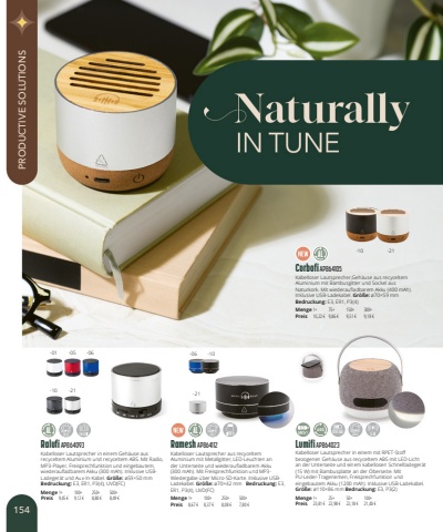 Corbofi AP864105Kabelloser Lautsprecher,Geh%u00e4use aus recyceltem Aluminium mit Bambusgitter und Sockel aus Naturkork. Mit wiederaufladbarem Akku (400mAh). Inklusive USB-Ladekabel. Gr%u00f6%u00dfe:%u00f870%u00d759mmBedruckung:E3, ER1, P3(4)Menge1+75+150+300+Preis10,22 %u20ac9,86 %u20ac9,51 %u20ac9,18 %u20acRalufi AP864093Kabelloser Lautsprecher in einem Geh%u00e4use aus recyceltem Aluminium und recyceltem ABS. Mit Radio, MP3-Player, Freisprechfunktion und eingebautem, wiederaufladbarem Akku (300mAh). Inklusive USBLadeger%u00e4t und Aux-In-Kabel. Gr%u00f6%u00dfe:%u00f859%u00d750mmBedruckung:E3, ER1, P3(4), UVD(FC)Menge1+100+250+500+Preis9,45 %u20ac9,12 %u20ac8,80 %u20ac8,49 %u20acRamesh AP864112Kabelloser Lautsprecher aus recyceltem Aluminium mit Metallgitter, LED-Leuchten an der Unterseite und wiederaufladbarem Akku (300mAh). Mit Freisprechfunktion und MP3-Wiedergabe %u00fcber Micro-SD-Karte. Inklusive USBLadekabel. Gr%u00f6%u00dfe:%u00f870%u00d742mm Bedruckung:E3, ER1, P3(4), UVD(FC)Menge1+100+250+500+Preis8,67 %u20ac8,37 %u20ac8,08 %u20ac7,80 %u20acLumifi AP864023Kabelloser Lautsprecher in einem mit RPET-Stoff bezogenen Geh%u00e4use aus recyceltem ABS mit LED-Licht an der Unterseite und einem kabellosen Schnellladeger%u00e4t (15 W) mit Bambusplatte an der Oberseite. Mit PU-Leder-Trageriemen, Freisprechfunktion und eingebautem Akku (1200mAh). Inklusive USB-Ladekabel.Gr%u00f6%u00dfe:%u00f8110%u00d786mm Bedruckung:E3, P3(2)Menge1+25+50+100+Preis23,81 %u20ac22,98 %u20ac22,18 %u20ac21,40 %u20ac-01-06-10-10-10-21-05-21-21-06AL1200 mAhALAL154PRODUCTIVE SOLUTIONS