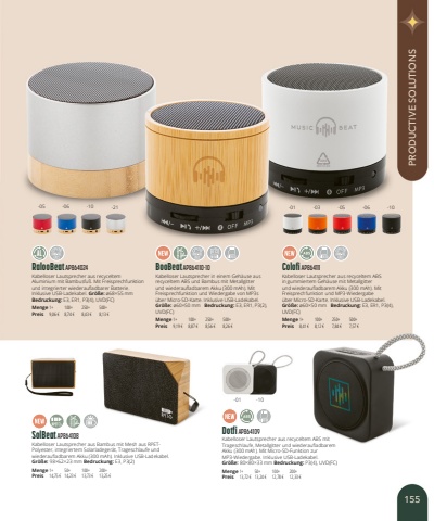 RalooBeat AP864024Kabelloser Lautsprecher aus recyceltem Aluminium mit Bambusfu%u00df. Mit Freisprechfunktion und integrierter wiederaufladbarer Batterie. Inklusive USB-Ladekabel. Gr%u00f6%u00dfe:%u00f868%u00d755mmBedruckung:E3, ER1, P3(4), UVD(FC)Menge1+100+250+500+Preis9,06 %u20ac8,74 %u20ac8,43 %u20ac8,13 %u20acSolBeat AP864108Kabelloser Lautsprecher aus Bambus mit Mesh aus RPETPolyester, integriertem Solarladeger%u00e4t, Trageschlaufe und wiederaufladbarem Akku (300mAh). Inklusive USB-Ladekabel.Gr%u00f6%u00dfe:98%u00d762%u00d723mm Bedruckung:E3, P3(2)Menge1+50+100+200+Preis14,75 %u20ac14,23 %u20ac13,73 %u20ac13,25 %u20acDotfi AP864109Kabelloser Lautsprecher aus recyceltem ABS mit Trageschlaufe, Metallgitter und wiederaufladbarem Akku (300mAh). Mit Micro-SD-Funktion zur MP3-Wiedergabe. Inklusive USB-Ladekabel.Gr%u00f6%u00dfe:80%u00d780%u00d733mm Bedruckung:P3(4), UVD(FC)Menge1+50+100+200+Preis13,72 %u20ac13,24 %u20ac12,78 %u20ac12,33 %u20acBooBeat AP864110-10Kabelloser Lautsprecher in einem Geh%u00e4use aus recyceltem ABS und Bambus mit Metallgitter und wiederaufladbarem Akku (300mAh). Mit Freisprechfunktion und Wiedergabe von MP3s %u00fcber Micro-SD-Karte. Inklusive USB-Ladekabel.Gr%u00f6%u00dfe:%u00f860%u00d750mmBedruckung:E3, ER1, P3(2), UVD(FC)Menge1+100+250+500+Preis9,19 %u20ac8,87 %u20ac8,56 %u20ac8,26 %u20acColofi AP864111Kabelloser Lautsprecher aus recyceltem ABS in gummiertem Geh%u00e4use mit Metallgitter und wiederaufladbarem Akku (300mAh). Mit Freisprechfunktion und MP3-Wiedergabe %u00fcber Micro-SD-Karte. Inklusive USB-Ladekabel.Gr%u00f6%u00dfe:%u00f860%u00d750mmBedruckung:E3, ER1, P3(4), UVD(FC)Menge1+100+250+500+Preis8,41 %u20ac8,12 %u20ac7,84 %u20ac7,57 %u20ac-01-05-06-10-21-10-01-03-05-06-10AL155PRODUCTIVE SOLUTIONS