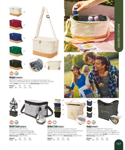 Kooper AP800091600D RPET-Polyester-K%u00fchltasche mit Rei%u00dfverschluss, Boden aus Naturkork, PEVA-Polsterung und verstellbarem Schultergurt. Mit RPETLabel. Gr%u00f6%u00dfe:220%u00d7170%u00d7145mm Bedruckung:TC(8), DTC(FC)Menge1+100+250+500+Preis5,95 %u20ac5,74 %u20ac5,54 %u20ac5,35 %u20acRefelt Cool AP800046K%u00fchltasche aus RPET-Filz mit Rei%u00dfverschluss, Aluminiumpolsterung, Fronttasche und seitlichen Tragegriffen. Mit RPET-Label. Gr%u00f6%u00dfe:250%u00d7155%u00d7145mmBedruckung:TC(8), DTC(FC)Menge1+100+250+500+Preis4,46 %u20ac4,30 %u20ac4,15 %u20ac4,00 %u20acRekan Cool AP800122Rolltop-K%u00fchltasche aus recyceltem Canvas mit Fronttasche, Aluminiumpolsterung und Klettverschluss. Material: 70 % recycelte Baumwolle und 30 % RPET-Polyester. Mit Label recycelte Baumwolle.Gr%u00f6%u00dfe:300%u00d7215%u00d735mm Bedruckung:TC(8), DTC(FC)Menge1+100+250+500+Preis5,50 %u20ac5,31 %u20ac5,12 %u20ac4,94 %u20acInupa AP800127K%u00fchltasche aus 600D RPET-Polyester mit Rei%u00dfverschluss, Details aus weichem recyceltem PU-Leder, Aluminiuminnenfutter und Tragegurt mit Schnalle. Mit RPET-Label. Gr%u00f6%u00dfe:272%u00d7200%u00d713mmBedruckung:TC(8), DTC(FC)Menge1+100+250+500+Preis5,56 %u20ac5,37 %u20ac5,18 %u20ac5,00 %u20ac-77-06A-10-77-10-07-06-05-00-80-07-10-06-00157GEARED FOR FUN