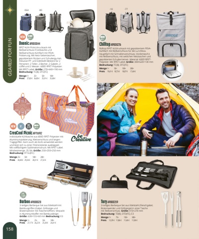 Duonic AP800044RPET-K%u00fchl-Picknickrucksack mit Rei%u00dfverschluss-Fronttasche und Rei%u00dfverschluss-K%u00fchlfach mit PEVAPolsterung. Mit Netz-Seitentaschen, gepolstertem R%u00fccken und Schultergurten. Inklusive PP- und Edelstahl-Besteck f%u00fcr 2 Personen: 2 Teller, 2 Becher, 2 Gabeln, 2 L%u00f6ffel und 2 Messer. 600D RPET-Polyester. Mit RPET-Label. Gr%u00f6%u00dfe:270%u00d7440%u00d7190mmBedruckung:TC(8), DTC(FC)Menge1+25+50+100+Preis27,82 %u20ac26,85 %u20ac25,91 %u20ac25,00 %u20acCreaCool Picnic AP716912Individuelle K%u00fchltasche aus 600D RPET-Polyester mit Aluminiumpolsterung, Klettverschluss und langen Tragegriffen. Kann auch als Korb verwendet werden und l%u00e4sst sich zu einer Picknickdecke ausklappen. Mit vollfl%u00e4chigem Sublimationsdruck. Mit RPET-Label. Mindestmenge: 25 Stk. Gr%u00f6%u00dfe:250%u00d7250%u00d7250mmBedruckung:FP-SU(FC)Menge25+50+100+200+Preis30,40 %u20ac29,34 %u20ac28,31 %u20ac27,32 %u20acBarboo AP8080283-teiliges Barbeque-Set aus Edelstahl mit Bambusgriffen (Gabel, Grillzange und Bratenwender mit Flaschen%u00f6ffner). Verpackt in Aluminiumkoffer mit Bambusdesign.Gr%u00f6%u00dfe:428%u00d7155%u00d760mm Bedruckung:E3Menge1+25+50+100+Preis27,17 %u20ac26,22 %u20ac25,30 %u20ac24,41 %u20acTory AP8003593-teiliges Barbeque-Set aus Edelstahl (Fleischgabel, Bratenwender und Grillzange) in einer Tasche mit Rei%u00dfverschluss. Gr%u00f6%u00dfe:410%u00d7270mmBedruckung:TD(8), DTD(FC), E3Menge1+75+150+300+Preis12,29 %u20ac11,86 %u20ac11,44 %u20ac11,04 %u20acChilltop AP808276Rolltop RPET-K%u00fchlrucksack mit gepolstertem PEVAK%u00fchlfach mit Rei%u00dfverschluss f%u00fcr die Lunchbox. Hauptfach mit Schnallenverschluss, Vordertasche mit Rei%u00dfverschluss, mit seitlichen Netztaschen und gepolsterten Schulterriemen. Material: 600D RPETPolyester. Mit RPET-Label. Gr%u00f6%u00dfe:300%u00d7620%u00d7130mmBedruckung:TC(8), DTC(FC)Menge1+50+100+200+Preis19,41 %u20ac18,73 %u20ac18,07 %u20ac17,44 %u20ac-10-06A-80-77158GEARED FOR FUN