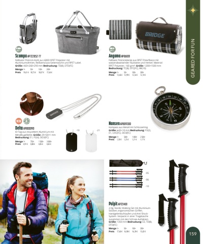 Scampa AP722852-77Faltbarer Picknick-Korb aus 600D RPET Polyester mit Aluminiumrahmen, Rei%u00dfverscluss-Seitentasche und RPET-Label.Gr%u00f6%u00dfe:460%u00d7260%u00d7290mm Bedruckung:TD(8), DTD(FC)Menge1+50+100+200+Preis19,41 %u20ac18,73 %u20ac18,07 %u20ac17,44 %u20acDelta AP800090ID-Tag aus recyceltem Aluminium mit Metallkugelkette. Gr%u00f6%u00dfe:29%u00d750%u00d71mmBedruckung:E1, P2(4), DO3(FC)Menge1+750+1 500+3 000+Preis0,91 %u20ac0,88 %u20ac0,85 %u20ac0,82 %u20acPulpit AP7214812-tlg. Nordic-Walking-Set mit AluminiumSt%u00f6cken, ergonomischen Griffen, Handgelenkschlaufen und Anti-ShockSystem. Verpackt in einer Tragetasche zusammen mit den Schnee-Aufs%u00e4tzen.Gr%u00f6%u00dfe:1350mm Bedruckung:E3, TD(8), DTD(FC)Menge1+50+100+200+Preis17,60 %u20ac16,98 %u20ac16,39 %u20ac15,82 %u20acAngama AP861011Faltbare Picknickdecke aus RPET-Polarfleece mit wasserabweisender R%u00fcckseite und Henkel. Material: RPET-Polyester, 160g/m%u00b2. Gr%u00f6%u00dfe:1200%u00d71500mmBedruckung:TC(8), DTC(FC), BR(10)Menge1+50+100+200+Preis13,46 %u20ac12,99 %u20ac12,54 %u20ac12,10 %u20acNansen AP809300Kompass aus Metall mit Schl%u00fcsselring.Gr%u00f6%u00dfe:%u00f843%u00d710mm Bedruckung:P2(2), E1, UVC(FC), DO3(FC)Menge1+500+1 000+2 500+Preis1,30 %u20ac1,25 %u20ac1,21 %u20ac1,17 %u20ac-10-05-06-10-21AL159GEARED FOR FUN