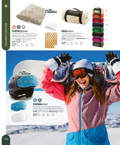 CreaFleece AP716970Individuelle RPET-Polarfleecedecke mit vollfarbig bedruckter Vorderseite. Material: RPET-Polyester (200g/m%u00b2). Der Preis ist inkl. Sublimationsdruck. Mindestmenge: 25 Stk. Gr%u00f6%u00dfe:1200%u00d71500mmBedruckung:FP-SU(FC)Menge25+50+100+200+Preis24,58 %u20ac23,72 %u20ac22,89 %u20ac22,09 %u20acVinson AP761799Polar Fleecedecke mit praktischem Trageband und Klettverschluss. Material: 100% Polyester (200g/m%u00b2).Gr%u00f6%u00dfe:1300%u00d71600mm Bedruckung:TD(8), DTD(FC), BR(10), E3Menge1+100+250+500+Preis7,76 %u20ac7,49 %u20ac7,23 %u20ac6,98 %u20acCreaSnow AP716522Individuelle Ski- und Snowboardbrillenh%u00fclle mit Gummiband und vollfl%u00e4chigem Sublimationsdruck. Material: 100% Polyester. Mindestmenge: 100 Stk.Gr%u00f6%u00dfe:200%u00d7110%u00d750mm Bedruckung:FP-SU(FC)Menge100+250+500+1 000+Preis3,93 %u20ac3,79 %u20ac3,66 %u20ac3,53 %u20ac-00-03-05-06A-07-10-25-77160GEARED FOR FUN