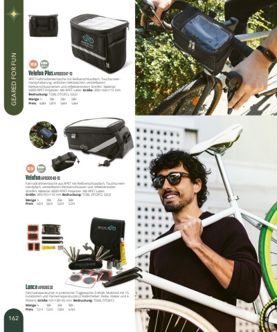 Velofon Plus AP800047-10RPET-Fahrradlenkertasche mit Rei%u00dfverschlussfach, TouchscreenHandyhalterung, seitlichen Netztaschen, verstellbaren Klettverschlussriemen und reflektierendem Streifen. Material: 600D RPET-Polyester. Mit RPET-Label. Gr%u00f6%u00dfe:200%u00d7160%u00d7115mmBedruckung:TC(8), DTC(FC), S2(2)Menge1+100+250+500+Preis6,08 %u20ac5,87 %u20ac5,66 %u20ac5,46 %u20acVelofon AP800048-10Fahrradrahmentasche aus RPET mit Rei%u00dfverschlussfach, TouchscreenHandyfach, verstellbaren Klettverschl%u00fcssen und reflektierenden Streifen. Material: 600D RPET-Polyester. Mit RPET-Label.Gr%u00f6%u00dfe:205%u00d795%u00d7110mm Bedruckung:TC(8), DTC(FC), S2(2)Menge1+100+250+500+Preis5,82 %u20ac5,62 %u20ac5,42 %u20ac5,23 %u20acLance AP808030Fahrradreparaturset in praktischer Tragetasche. Enth%u00e4lt: Multitool mit 15 Funktionen und Pannenreparaturset (2 Reifenheber, Reibe, Kleber und 6 Flicken). Gr%u00f6%u00dfe:93%u00d7130%u00d735mm Bedruckung:TD(8), DTD(FC)Menge1+100+250+500+Preis7,51 %u20ac7,25 %u20ac7,00 %u20ac6,76 %u20ac162GEARED FOR FUN