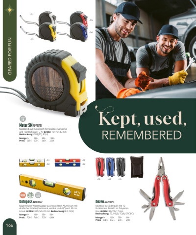 Meter 5M AP741721Ma%u00dfband aus Kunststoff mit Stopper, Metallclip und Handschlaufe, 5 m. Gr%u00f6%u00dfe:70%u00d770%u00d735mmBedruckung:DO3(FC), P2(4)Menge1+250+500+1 000+Preis2,85 %u20ac2,75 %u20ac2,65 %u20ac2,56 %u20acRatupass AP800147Magnetische Wasserwaage aus recyceltem Aluminium mit dreifacher Libelle (horizontal, vertikal und 45%u00b0) und 30cm Lineal. Gr%u00f6%u00dfe:300%u00d750%u00d720mm Bedruckung:E2, P2(2)Menge1+100+250+500+Preis7,76 %u20ac7,49 %u20ac7,23 %u20ac6,98 %u20acDozen AP791020Multitool aus Edelstahl mit 12 Funktionen. Einzeln im PolyesterEtui. Gr%u00f6%u00dfe:30%u00d770%u00d717mmBedruckung:E2, P2(2), TC(8), DTC(FC)Menge1+100+250+500+Preis6,88 %u20ac6,64 %u20ac6,41 %u20ac6,19 %u20ac-05-06-02-01-05-01-05-02-06-06-10AL166GEARED FOR FUN
