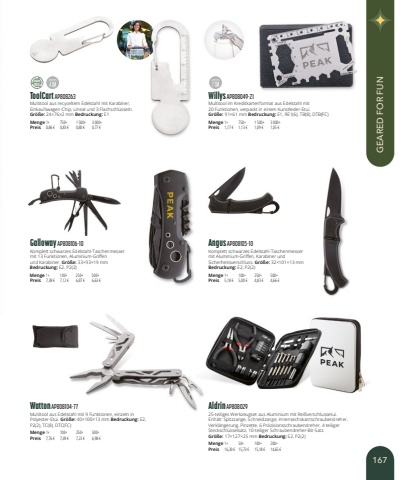 Watton AP808104-77Multitool aus Edelstahl mit 9 Funktionen, einzeln in Polyester-Etui. Gr%u00f6%u00dfe:40%u00d7100%u00d713mm Bedruckung:E2, P2(2), TC(8), DTC(FC)Menge1+100+250+500+Preis7,76 %u20ac7,49 %u20ac7,23 %u20ac6,98 %u20acGalloway AP808106-10Komplett schwarzes Edelstahl-Taschenmesser mit 13 Funktionen, Aluminium-Griffen und Karabiner. Gr%u00f6%u00dfe:33%u00d793%u00d719mmBedruckung:E2, P2(2)Menge1+100+250+500+Preis7,38 %u20ac7,12 %u20ac6,87 %u20ac6,63 %u20acAngus AP808105-10Komplett schwarzes Edelstahl-Taschenmesser mit Aluminium-Griffen, Karabiner und Sicherheitsverschluss. Gr%u00f6%u00dfe:32%u00d7101%u00d713mmBedruckung:E2, P2(2)Menge1+100+250+500+Preis5,18 %u20ac5,00 %u20ac4,83 %u20ac4,66 %u20acToolCart AP808263Multitool aus recyceltem Edelstahl mit Karabiner, Einkaufswagen-Chip, Lineal und 3 Flachschl%u00fcsseln.Gr%u00f6%u00dfe:24%u00d776%u00d72mm Bedruckung:E1Menge1+750+1 500+3 000+Preis0,86 %u20ac0,83 %u20ac0,80 %u20ac0,77 %u20acAldrin AP80802925-teiliges Werkzeugset aus Aluminium mit Rei%u00dfverschlussetui. Enh%u00e4lt: Spitzzange, Schneidzange, Innensechskantschraubendreher, Verkl%u00e4ngerung, Pinzette, 6 Pr%u00e4zisionsschraubendreher, 4-teiliger Steckschl%u00fcsselsatz, 10-teiliger Schraubendreher-Bit-Satz.Gr%u00f6%u00dfe:17%u00d7127%u00d725mm Bedruckung:E2, P2(2)Menge1+50+100+200+Preis16,30 %u20ac15,73 %u20ac15,18 %u20ac14,65 %u20acWillys AP808049-21Multitool im Kreditkartenformat aus Edelstahl mit 20 Funktionen, verpackt in einem Kunstleder-Etui.Gr%u00f6%u00dfe:91%u00d761mm Bedruckung:E1, RE1(6), TB(8), DTB(FC)Menge1+750+1 500+3 000+Preis1,17 %u20ac1,13 %u20ac1,09 %u20ac1,05 %u20acSTAINLESSSTEEL167GEARED FOR FUN