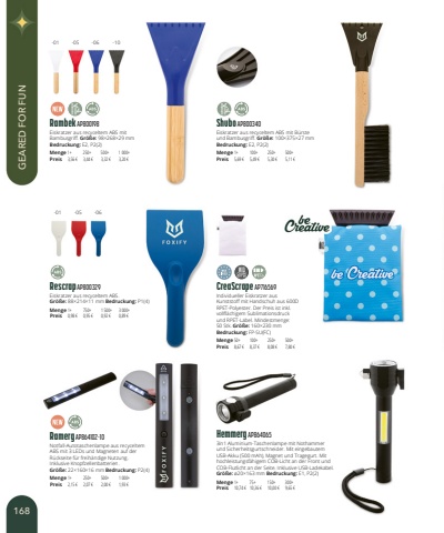 Rambek AP800198Eiskratzer aus recyceltem ABS mit Bambusgriff. Gr%u00f6%u00dfe:98%u00d7268%u00d729mmBedruckung:E2, P2(2)Menge1+250+500+1 000+Preis3,56 %u20ac3,44 %u20ac3,32 %u20ac3,20 %u20acRescrap AP800329Eiskratzer aus recyceltem ABS.Gr%u00f6%u00dfe:88%u00d7214%u00d711mm Bedruckung:P1(4)Menge1+750+1 500+3 000+Preis0,98 %u20ac0,95 %u20ac0,92 %u20ac0,89 %u20acRamerg AP864102-10Notfall-Autotaschenlampe aus recyceltem ABS mit 3 LEDs und Magneten auf der R%u00fcckseite f%u00fcr freih%u00e4ndige Nutzung. Inklusive Knopfzellenbatterien.Gr%u00f6%u00dfe:22%u00d7160%u00d716mm Bedruckung:P2(4)Menge1+250+500+1 000+Preis2,15 %u20ac2,07 %u20ac2,00 %u20ac1,93 %u20acShubo AP800340Eiskratzer aus recyceltem ABS mit B%u00fcrste und Bambusgriff. Gr%u00f6%u00dfe:100%u00d7375%u00d727mmBedruckung:E2, P2(2)Menge1+100+250+500+Preis5,69 %u20ac5,49 %u20ac5,30 %u20ac5,11 %u20acCreaScrape AP716569Individueller Eiskratzer aus Kunststoff mit Handschuh aus 600D RPET-Polyester. Der Preis ist inkl. vollfl%u00e4chigem Sublimationsdruck und RPET-Label. Mindestmenge: 50 Stk. Gr%u00f6%u00dfe:160%u00d7230mmBedruckung:FP-SU(FC)Menge50+100+250+500+Preis8,67 %u20ac8,37 %u20ac8,08 %u20ac7,80 %u20acHemmerg AP8640653in1 Aluminium-Taschenlampe mit Nothammer und Sicherheitsgurtschneider. Mit eingebautem USB-Akku (500mAh), Magnet und Tragegurt. Mit hochleistungsf%u00e4higem COB-Licht an der Front und COB-Flutlicht an der Seite. Inklusive USB-Ladekabel.Gr%u00f6%u00dfe:%u00f820%u00d7163mm Bedruckung:E1, P2(2)Menge1+75+150+300+Preis10,74 %u20ac10,36 %u20ac10,00 %u20ac9,65 %u20ac-01-05-06-01-05-06-10168GEARED FOR FUN