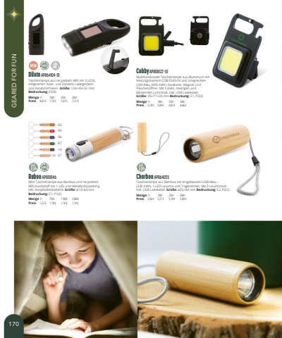 Diluto AP864104-10Taschenlampe aus recyceltem ABS mit 3 LEDs, integrierten Solar- und Dynamo-Ladeger%u00e4ten und Karabinerhaken. Gr%u00f6%u00dfe:124%u00d745%u00d732mmBedruckung:P2(4)Menge1+100+250+500+Preis8,02 %u20ac7,74 %u20ac7,47 %u20ac7,21 %u20acRaboo AP808146Mini-Taschenlampe aus Bambus und recyceltem ABS Kunststoff mit 1 LED und Metallschl%u00fcsselring. Inkl. Knopfzellenbatterie. Gr%u00f6%u00dfe:%u00f814%u00d764mmBedruckung:E1, P1(2)Menge1+750+1 500+3 000+Preis1,22 %u20ac1,18 %u20ac1,14 %u20ac1,10 %u20acCobby AP808122-10Multifunktionale Taschenlampe aus Aluminium mit leistungsstarkem COB-Flutlicht und integriertem USB-Akku (400mAh), Karabiner, Magnet und Flaschen%u00f6ffner. Mit hohen, niedrigen und blinkenden Lichtmodi. Inkl. USB-Ladekabel.Gr%u00f6%u00dfe:45%u00d771%u00d720mm Bedruckung:E1, P2(2)Menge1+100+250+500+Preis5,18 %u20ac5,00 %u20ac4,83 %u20ac4,66 %u20acCharboo AP864055Taschenlampe aus Bambus mit eingebautem USB-Akku (320mAh), 1 LED-Leuchte und Trageriemen. Mit 3 Leuchtmodi. Inkl. USB-Ladekabel. Gr%u00f6%u00dfe:%u00f825%u00d784mm Bedruckung:E2, P2(2)Menge1+100+250+500+Preis5,56 %u20ac5,37 %u20ac5,18 %u20ac5,00 %u20ac-03-05-06-07-10-21170GEARED FOR FUN