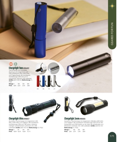 Chargelight Tone AP864122Taschenlampe aus recyceltem Aluminium mit integriertem, per USB aufladbarem Akku (400mAh) und Trageschlaufe. Mit zoombarem Hochleistungs-COB-Licht und 3 Leuchtmodi. Inklusive USB-Ladekabel.Gr%u00f6%u00dfe:%u00f823%u00d7100mm Bedruckung:E1, P2(2)Menge1+100+250+500+Preis4,40 %u20ac4,25 %u20ac4,10 %u20ac3,96 %u20acChargelight Ultra AP808127Aluminium-Taschenlampe mit integriertem USBAkku (1500mAh) und Tragegurt. Mit zoombarem Hochleistungs-COB-Licht. Mit hohen, mittleren, niedrigen und blinkenden Lichtmodi. Inkl. USBLadekabel. Gr%u00f6%u00dfe:%u00f840%u00d7165mm Bedruckung:E2, P3(2)Menge1+50+100+200+Preis16,82 %u20ac16,23 %u20ac15,66 %u20ac15,11 %u20acChargelight Zoom AP808126Aluminium-Taschenlampe mit integriertem USB-Akku (400mAh) und Tragegurt. Mit zoombarem Hochleistungs-COB-Licht an der Vorderseite und COB-Flutlicht an der Seite. Mit anhaltenden und blinkenden Lichtmodi. Inkl. USB-Ladekabel. Gr%u00f6%u00dfe:%u00f824%u00d792mmBedruckung:E1, P2(2)Menge1+100+250+500+Preis5,56 %u20ac5,37 %u20ac5,18 %u20ac5,00 %u20ac-05-06-10-21AL171GEARED FOR FUN