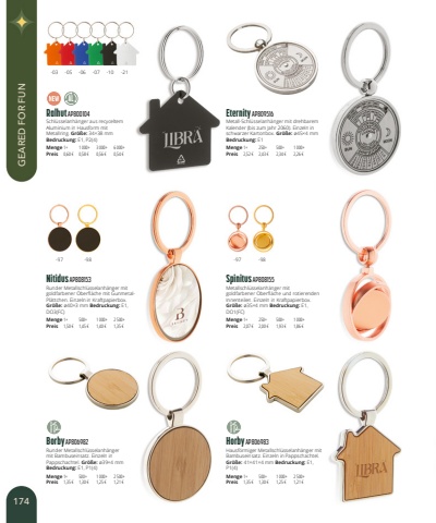 Ralhut AP800104Schl%u00fcsselanh%u00e4nger aus recyceltem Aluminium in Hausform mit Metallring. Gr%u00f6%u00dfe:34%u00d738mmBedruckung:E1, P2(4)Menge1+1 000+3 000+6 000+Preis0,60 %u20ac0,58 %u20ac0,56 %u20ac0,54 %u20acNitidus AP808153Runder Metallschl%u00fcsselanh%u00e4nger mit goldfarbener Oberfl%u00e4che mit GunmetalPl%u00e4ttchen. Einzeln in Kraftpapierbox.Gr%u00f6%u00dfe:%u00f840%u00d73mm Bedruckung:E1, DO3(FC)Menge1+500+1 000+2 500+Preis1,50 %u20ac1,45 %u20ac1,40 %u20ac1,35 %u20acBorby AP806982Runder Metallschl%u00fcsselanh%u00e4nger mit Bambuseinsatz. Einzeln in Pappschachtel. Gr%u00f6%u00dfe:%u00f839%u00d74mmBedruckung:E1, P1(4)Menge1+500+1 000+2 500+Preis1,35 %u20ac1,30 %u20ac1,25 %u20ac1,21 %u20acEternity AP809516Metall-Schl%u00fcsselanh%u00e4nger mit drehbarem Kalender (bis zum Jahr 2060). Einzeln in schwarzer Kartonbox. Gr%u00f6%u00dfe:%u00f845%u00d74mmBedruckung:E1Menge1+250+500+1 000+Preis2,52 %u20ac2,43 %u20ac2,34 %u20ac2,26 %u20acSpinitus AP808155Metallschl%u00fcsselanh%u00e4nger mit goldfarbener Oberfl%u00e4che und rotierenden Innenteilen. Einzeln in Kraftpapierbox.Gr%u00f6%u00dfe:%u00f835%u00d74mm Bedruckung:E1, DO1(FC)Menge1+250+500+1 000+Preis2,07 %u20ac2,00 %u20ac1,93 %u20ac1,86 %u20acHorby AP806983Hausf%u00f6rmiger Metallschl%u00fcsselanh%u00e4nger mit Bambuseinsatz. Einzeln in Pappschachtel.Gr%u00f6%u00dfe:41%u00d741%u00d74mm Bedruckung:E1, P1(4)Menge1+500+1 000+2 500+Preis1,35 %u20ac1,30 %u20ac1,25 %u20ac1,21 %u20ac-98-05-06-07-10-21-97-03-97-98AL174GEARED FOR FUN