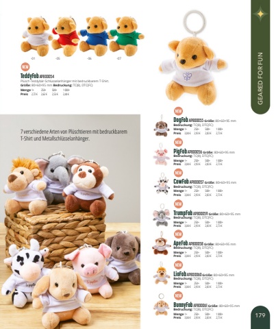 TeddyFob AP800054Pl%u00fcsch-Teddyb%u00e4r-Schl%u00fcsselanh%u00e4nger mit bedruckbarem T-Shirt.Gr%u00f6%u00dfe:80%u00d760%u00d795mm Bedruckung:TC(8), DTC(FC)Menge1+250+500+1 000+Preis2,72 %u20ac2,62 %u20ac2,53 %u20ac2,44 %u20acDogFob AP800055 Gr%u00f6%u00dfe:80%u00d760%u00d795mmBedruckung:TC(8), DTC(FC)Menge1+250+500+1 000+Preis3,04 %u20ac2,93 %u20ac2,83 %u20ac2,73 %u20acPigFob AP800056 Gr%u00f6%u00dfe:80%u00d760%u00d795mmBedruckung:TC(8), DTC(FC)Menge1+250+500+1 000+Preis3,04 %u20ac2,93 %u20ac2,83 %u20ac2,73 %u20acCowFob AP800057 Gr%u00f6%u00dfe:80%u00d760%u00d795mmBedruckung:TC(8), DTC(FC)Menge1+250+500+1 000+Preis3,04 %u20ac2,93 %u20ac2,83 %u20ac2,73 %u20acTrumpFob AP800059 Gr%u00f6%u00dfe:80%u00d760%u00d795mmBedruckung:TC(8), DTC(FC)Menge1+250+500+1 000+Preis3,04 %u20ac2,93 %u20ac2,83 %u20ac2,73 %u20acApeFob AP800058 Gr%u00f6%u00dfe:80%u00d760%u00d795mmBedruckung:TC(8), DTC(FC)Menge1+250+500+1 000+Preis3,04 %u20ac2,93 %u20ac2,83 %u20ac2,73 %u20acLioFob AP800060 Gr%u00f6%u00dfe:80%u00d760%u00d795mmBedruckung:TC(8), DTC(FC)Menge1+250+500+1 000+Preis3,04 %u20ac2,93 %u20ac2,83 %u20ac2,73 %u20acBunnyFob AP800061 Gr%u00f6%u00dfe:80%u00d760%u00d795mmBedruckung:TC(8), DTC(FC)Menge1+250+500+1 000+Preis3,04 %u20ac2,93 %u20ac2,83 %u20ac2,73 %u20ac7 verschiedene Arten von Pl%u00fcschtieren mit bedruckbarem T-Shirt und Metallschl%u00fcsselanh%u00e4nger.-01-05-06-07179GEARED FOR FUN