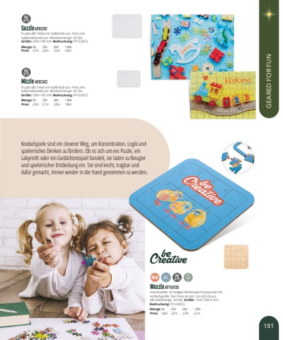 Suzzle AP812411Puzzle (80 Teile) mit Vollfarbdruck. Preis inkl. Sublimationsdruck. Mindestmenge: 50 Stk.Gr%u00f6%u00dfe:240%u00d7190mm Bedruckung:FP-SU(FC)Menge50+250+500+1 000+Preis2,72 %u20ac2,62 %u20ac2,53 %u20ac2,44 %u20acMizzle AP812413Puzzle (80 Teile) mit Vollfarbdruck. Preis inkl. Sublimationsdruck. Mindestmenge: 50 Stk.Gr%u00f6%u00dfe:200%u00d7145mm Bedruckung:FP-SU(FC)Menge50+250+500+1 000+Preis2,20 %u20ac2,12 %u20ac2,05 %u20ac1,98 %u20acWozzle AP716938Individuelles 16-teiliges Birkensperrholzpuzzle mit Vollfarbgrafik. Der Preis ist inkl. UV-LED-Druck. Mindestmenge: 50 Stk. Gr%u00f6%u00dfe:150%u00d7150%u00d73mmBedruckung:FP-UV(FC)Menge50+250+500+1 000+Preis2,46 %u20ac2,37 %u20ac2,29 %u20ac2,21 %u20acKnobelspiele sind ein cleverer Weg, um Konzentration, Logik und spielerisches Denken zu f%u00f6rdern. Ob es sich um ein Puzzle, ein Labyrinth oder ein Ged%u00e4chtnisspiel handelt, sie laden zu Neugier und spielerischer Entdeckung ein. Sie sind leicht, tragbar und daf%u00fcr gemacht, immer wieder in die Hand genommen zu werden.181GEARED FOR FUN