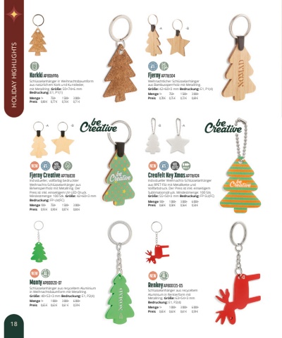 Korkki AP806996Schl%u00fcsselanh%u00e4nger in Weihnachtsbaumform aus nat%u00fcrlichem Kork und Kunstleder, mit Metallring. Gr%u00f6%u00dfe:50%u00d774%u00d76mmBedruckung:E1, P1(1)Menge1+750+1 500+3 000+Preis0,80 %u20ac0,77 %u20ac0,74 %u20ac0,71 %u20acFjerny AP716504Weihnachtlicher Schl%u00fcsselanh%u00e4nger aus Bambussperrholz mit Metallring.Gr%u00f6%u00dfe:42%u00d760%u00d73mm Bedruckung:E1, P1(4)Menge1+750+1 500+3 000+Preis0,78 %u20ac0,75 %u20ac0,72 %u20ac0,69 %u20acFjerny Creative AP716838Individueller, vollfarbig bedruckter Weihnachts-Schl%u00fcsselanh%u00e4nger aus Birkensperrholz mit Metallring. Der Preis ist inkl. einseitigem UV-LED-Druck. Mindestmenge: 100 Stk. Gr%u00f6%u00dfe:42%u00d760%u00d73mmBedruckung:FP-UV(FC)Menge100+750+1 500+3 000+Preis0,93 %u20ac0,90 %u20ac0,87 %u20ac0,84 %u20acCreaFelt Key Xmas AP716924Individueller Weihnachts-Schl%u00fcsselanh%u00e4nger aus RPET-Filz mit Metallkette und Vollfarbdruck. Der Preis ist inkl. einseitigem Sublimationsdruck. Mindestmenge: 100 Stk.Gr%u00f6%u00dfe:55%u00d750%u00d73mm Bedruckung:FP-SU(FC)Menge100+1 000+3 000+6 000+Preis0,60 %u20ac0,58 %u20ac0,56 %u20ac0,54 %u20acManty AP800120-07Schl%u00fcsselanh%u00e4nger aus recyceltem Aluminium in Weihnachtsbaumform mit Metallring.Gr%u00f6%u00dfe:40%u00d753%u00d73mm Bedruckung:E1, P2(4)Menge1+1 000+3 000+6 000+Preis0,65 %u20ac0,63 %u20ac0,61 %u20ac0,59 %u20acRenkey AP800135-05Schl%u00fcsselanh%u00e4nger aus recyceltem Aluminium in Rentierform mit Metallring. Gr%u00f6%u00dfe:63%u00d754%u00d73mmBedruckung:E1, P2(4)Menge1+1 000+3 000+6 000+Preis0,65 %u20ac0,63 %u20ac0,61 %u20ac0,59 %u20ac-B-A-B-A-B-AALAL18HOLIDAY HIGHLIGHTS