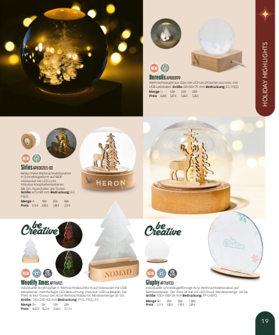 Woodify Xmas AP716921Individuelle Acryltroph%u00e4e in Weihnachtsbaumform auf Holzsockel mit USBbetriebener, mehrfarbiger LED-Beleuchtung. Inklusive USB-Ladekabel. Der Preis ist inkl. Gravur des Acryl-Weihnachtsbaums. Mindestmenge: 25 Stk.Gr%u00f6%u00dfe:145%u00d7205%u00d760mm Bedruckung:FP-E, P3(2), E3Menge25+50+100+200+Preis16,82 %u20ac16,23 %u20ac15,66 %u20ac15,11 %u20acSirius AP800205-00Beleuchtete Weihnachtsdekoration in Schneekugelform auf MDFHolzsockel mit LED-Licht. Inklusive Knopfzellenbatterien. Mit Ein-/Ausschalter am Sockel.Gr%u00f6%u00dfe:%u00f875%u00d780mm Bedruckung:E2, P2(2)Menge1+100+250+500+Preis4,14 %u20ac4,00 %u20ac3,86 %u20ac3,72 %u20acBorealis AP800199Weihnachtskugel aus Glas mit LED-Leuchtsockel aus Holz. Inkl. USB-Ladekabel. Gr%u00f6%u00dfe:60%u00d760%u00d775mm Bedruckung:E3, P3(2)Menge1+100+250+500+Preis6,08 %u20ac5,87 %u20ac5,66 %u20ac5,46 %u20acGlophy AP716933Individuelle, schneekugelf%u00f6rmige Acryl-Weihnachtsdekoration auf Bambusst%u00e4nder. Der Preis ist inkl UV-LED-Druck. Mindestmenge: 50 Stk.Gr%u00f6%u00dfe:100%u00d7100%u00d736mm Bedruckung:FP-UV(FC)Menge50+250+500+1 000+Preis3,11 %u20ac3,00 %u20ac2,90 %u20ac2,80 %u20ac19HOLIDAY HIGHLIGHTS