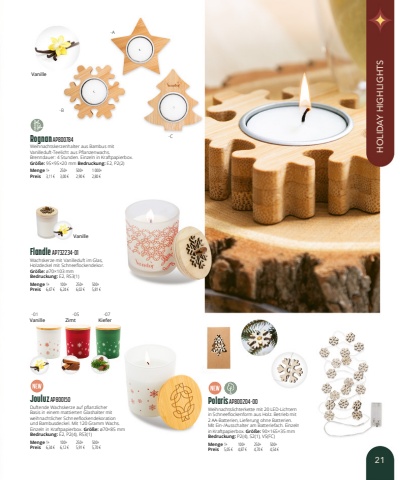 Rognan AP800784Weihnachtskerzenhalter aus Bambus mit Vanilleduft-Teelicht aus Pflanzenwachs. Brenndauer: 4 Stunden. Einzeln in Kraftpapierbox.Gr%u00f6%u00dfe:95%u00d795%u00d720mm Bedruckung:E2, P2(2)Menge1+250+500+1 000+Preis3,11 %u20ac3,00 %u20ac2,90 %u20ac2,80 %u20acJouluz AP800150Duftende Wachskerze auf pflanzlicher Basis in einem mattierten Glashalter mit weihnachtlicher Schneeflockendekoration und Bambusdeckel. Mit 120 Gramm Wachs. Einzeln in Kraftpapierbox. Gr%u00f6%u00dfe:%u00f870%u00d785mmBedruckung:E2, P2(4), RS3(1)Menge1+100+250+500+Preis6,34 %u20ac6,12 %u20ac5,91 %u20ac5,70 %u20acFlandle AP732234-01Wachskerze mit Vanilleduft im Glas, Holzdeckel mit Schneeflockendekor.Gr%u00f6%u00dfe:%u00f870%u00d7103mmBedruckung:E2, RS3(1)Menge1+100+250+500+Preis6,47 %u20ac6,24 %u20ac6,02 %u20ac5,81 %u20ac-01-B-A-C-05-07VanilleVanilleZimtKieferVanillePolaris AP800204-00Weihnachtslichterkette mit 20 LED-Lichtern in Schneeflockenform aus Holz. Betrieb mit 2 AA-Batterien, Lieferung ohne Batterien. Mit Ein-/Ausschalter am Batteriefach. Einzeln in Kraftpapierbox. Gr%u00f6%u00dfe:90%u00d7165%u00d735mmBedruckung:P2(4), S2(1), VS(FC)Menge1+100+250+500+Preis5,05 %u20ac4,87 %u20ac4,70 %u20ac4,54 %u20ac21HOLIDAY HIGHLIGHTS