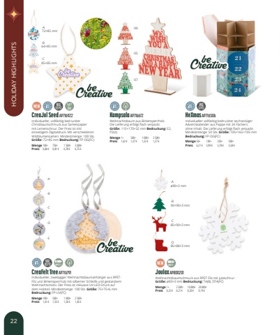 CreaFelt Tree AP716791Individueller, zweilagiger Weihnachtsbaumanh%u00e4nger aus RPETFilz und Birkensperrholz mit silberner Schleife und gestanztem Weihnachtsmotiv. Der Preis ist inklusive UV-LED-Druck auf dem Holzteil. Mindestmenge: 100 Stk. Gr%u00f6%u00dfe:75%u00d775%u00d76mmBedruckung:FP-UV(FC)Menge100+500+1 000+2 500+Preis1,61 %u20ac1,55 %u20ac1,50 %u20ac1,45 %u20acKampsala AP716672Weihnachtsbaum aus Birkensperrholz. Die Lieferung erfolgt flach verpackt.Gr%u00f6%u00dfe:115%u00d7170%u00d732mm Bedruckung:E2, P2(4)Menge1+500+1 000+2 500+Preis1,42 %u20ac1,37 %u20ac1,32 %u20ac1,27 %u20acCreaJul Seed AP716922Individueller, vollfarbig bedruckter Christbaumschmuck aus Samenpapier mit Leinenschnur. Der Preis ist inkl einseitigem Digitaldruck. Mit verschiedenen Wildblumensamen. Mindestmenge: 100 Stk.Gr%u00f6%u00dfe:72%u00d785mm Bedruckung:FP-DG(FC)Menge100+750+1 500+3 000+Preis0,84 %u20ac0,81 %u20ac0,78 %u20ac0,75 %u20acHeXmas AP716506Individueller vollfarbig bedruckter sechseckiger Adventskalender aus Pappe mit 24 F%u00e4chern, ohne Inhalt. Die Lieferung erfolgt flach verpackt. Mindestmenge: 50 Stk. Gr%u00f6%u00dfe:105%u00d7165%u00d7105mmBedruckung:FP-DG(FC)Menge50+100+250+500+Preis6,21 %u20ac5,99 %u20ac5,78 %u20ac5,58 %u20acJoulox AP800201Weihnachtsbaumschmuck aus RPET-Filz mit Juteschnur.Gr%u00f6%u00dfe:%u00f890%u00d73mm Bedruckung:TA(8), DTA(FC)Menge1+2 500+10 000+20 000+Preis0,22 %u20ac0,21 %u20ac0,20 %u20ac0,19 %u20ac-07-05-00-A-A-C-B-A-B-B-C-C-D-D-E72%u00d785mm64%u00d785mm85%u00d785mm%u00f890%u00d73mm90%u00d790%u00d73mm85%u00d790%u00d73mm85%u00d788%u00d73mmSEED22HOLIDAY HIGHLIGHTS