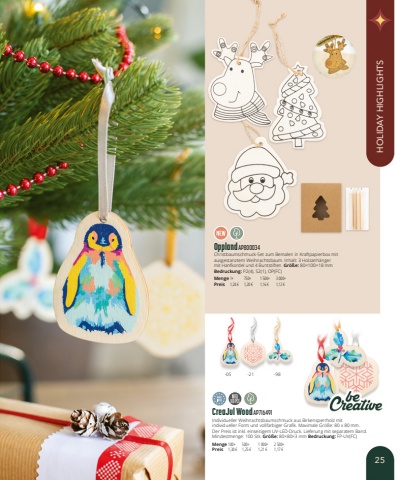 CreaJul Wood AP716491Individueller Weihnachtsbaumschmuck aus Birkensperrholz mit individueller Form und vollfarbiger Grafik. Maximale Gr%u00f6%u00dfe: 80 x 80mm. Der Preis ist inkl. einseitigem UV-LED-Druck. Lieferung mit separatem Band. Mindestmenge: 100 Stk. Gr%u00f6%u00dfe:80%u00d780%u00d73mm Bedruckung:FP-UV(FC)Menge100+500+1 000+2 500+Preis1,30 %u20ac1,25 %u20ac1,21 %u20ac1,17 %u20acOppland AP800034Christbaumschmuck-Set zum Bemalen in Kraftpapierbox mit ausgestanztem Weihnachtsbaum. Inhalt: 3 Holzanh%u00e4nger mit Hanfkordel und 4 Buntstiften. Gr%u00f6%u00dfe:80%u00d7100%u00d718mmBedruckung:P2(4), S2(1), OP(FC)Menge1+750+1 500+3 000+Preis1,24 %u20ac1,20 %u20ac1,16 %u20ac1,12 %u20ac-05-21-9825HOLIDAY HIGHLIGHTS