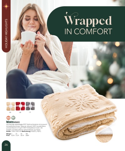 Valsatra AP861013Hochwertige doppellagige RPET-Weihnachtsdecke mit JacquardSchneeflockenmuster. Material: 260g/m%u00b2 RPET-Korallenfleece und wendbarem 210g/m%u00b2 RPET-Sherpafleece-Futter. Mit Schleife und bedruckbarer Geschenkkarte aus Papier.Gr%u00f6%u00dfe:1200%u00d71500mm Bedruckung:DG3(FC), VS(FC)Menge1+25+50+100+Preis32,35 %u20ac31,22 %u20ac30,13 %u20ac29,08 %u20ac-00-08-7726HOLIDAY HIGHLIGHTS