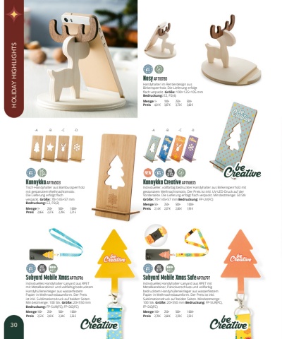 Nosy AP718780Handyhalter im Rentierdesign aus Birkensperrholz. Die Lieferung erfolgt flach verpackt. Gr%u00f6%u00dfe:100%u00d7125%u00d7105mmBedruckung:E2, P2(4)Menge1+100+250+500+Preis4,01 %u20ac3,87 %u20ac3,73 %u20ac3,60 %u20acKannykka Creative AP716835Individueller, vollfarbig bedruckter Handyhalter aus Birkensperrholz mit gestanztem Weihnachtsmotiv. Der Preis ist inkl. UV-LED-Druck auf der Vorderseite. Die Lieferung erfolgt flach verpackt. Mindestmenge: 50 StkGr%u00f6%u00dfe:70%u00d7145%u00d757mm Bedruckung:FP-UV(FC)Menge50+250+500+1 000+Preis2,14 %u20ac2,07 %u20ac2,00 %u20ac1,93 %u20acKannykka AP716503Tisch-Handyhalter aus Bambussperrholz mit gestanztem Weihnachtsmotiv. Die Lieferung erfolgt flach verpackt. Gr%u00f6%u00dfe:70%u00d7145%u00d757mmBedruckung:E2, P2(2)Menge1+250+500+1 000+Preis2,46 %u20ac2,37 %u20ac2,29 %u20ac2,21 %u20acSubyard Mobile Xmas Safe AP716797Individuelles Handyhalter-Lanyard aus RPET mit Metallkarabiner, Panickverschluss und vollfarbig bedrucktem Handyh%u00fclleneinleger aus wasserfestem Papier in Weihnachtsbaumform. Der Preis ist inkl. Sublimationsdruck auf beiden Seiten. Mindestmenge: 100 Stk. Gr%u00f6%u00dfe:20%u00d7550mm Bedruckung:FP-SUR(FC), FP-DG(FC)Menge100+250+500+1 000+Preis2,78 %u20ac2,68 %u20ac2,59 %u20ac2,50 %u20acSubyard Mobile Xmas AP716796Individuelles Handyhalter-Lanyard aus RPET mit Metallkarabiner und vollfarbig bedrucktem Handyh%u00fclleneinleger aus wasserfestem Papier in Weihnachtsbaumform. Der Preis ist inkl. Sublimationsdruck auf beiden Seiten. Mindestmenge: 100 Stk. Gr%u00f6%u00dfe:20%u00d7550mmBedruckung:FP-SUR(FC), FP-DG(FC)Menge100+250+500+1 000+Preis2,52 %u20ac2,43 %u20ac2,34 %u20ac2,26 %u20ac-A-B-C-D-A-B-C-D30HOLIDAY HIGHLIGHTS