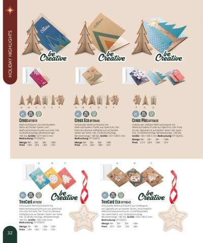 Creax AP718174Weihnachtskarte mit individuellem Motiv auf beiden Seiten und Weihnachtsmotiv-Puzzle aus Holz. Inkl. C6 Briefumschlag. Mindestmenge: 100 Stk. Gr%u00f6%u00dfe:107%u00d7148%u00d73mmBedruckung:FP-DG(FC)Menge100+250+500+1 000+Preis1,94 %u20ac1,87 %u20ac1,80 %u20ac1,74 %u20acCreax Eco AP718646Individuelle Weihnachtskarte mit Weihnachtsdeko-Puzzle aus Sperrholz. Der Preis ist inklusive Vollfarbdruck auf beiden Seiten der Karte. Inkl. C6-Briefumschlag. Mindestmenge: 100 Stk. Gr%u00f6%u00dfe:107%u00d7148%u00d73mmBedruckung:FP-DG(FC)Menge100+250+500+1 000+Preis2,12 %u20ac2,05 %u20ac1,98 %u20ac1,91 %u20acCreax Plus AP718658Individuelle, faltbare Weihnachtskarte mit Weihnachtsdeko-Puzzle aus Sperrhoz. Der Preis ist inkl. Digitaldruck auf beiden Seiten der Karte. Inkl. C6-Briefumschlag. Mindestmenge: 100 Stk.Gr%u00f6%u00dfe:105%u00d7148%u00d73mm Bedruckung:FP-DG(FC)Menge100+250+500+1 000+Preis2,12 %u20ac2,05 %u20ac1,98 %u20ac1,91 %u20acTreeCard AP718781Individuelle Weihnachtskarte mit Weihnachtsbaumschmuck aus Sperrholz mit roter Schleife. Der Preis ist inklusive Vollfarbdruck auf beiden Seiten der Karte. Inkl. C6 Briefumschlag. Mindestmenge: 100 Stk. Gr%u00f6%u00dfe:105%u00d7148%u00d73mmBedruckung:FP-DG(FC)Menge100+500+1 000+2 500+Preis1,89 %u20ac1,82 %u20ac1,76 %u20ac1,70 %u20acTreeCard Eco AP718645Individuelle Weihnachtskarte aus Kraftpapier mit Digitaldruck auf beiden Seiten, einschlie%u00dflich Weihnachtsbaumschmuck in Holzfaserplatte mit rotem Band. Inkl. C6-Briefumschlag. Mindestmenge: 100 Stk. Gr%u00f6%u00dfe:105%u00d7148%u00d73mmBedruckung:FP-DG(FC)Menge100+250+500+1 000+Preis2,07 %u20ac2,00 %u20ac1,93 %u20ac1,86 %u20ac-A-A-B-C-D-E-F-A-B-C-D-E-F-F-A-D-A-B-C-B-C32HOLIDAY HIGHLIGHTS