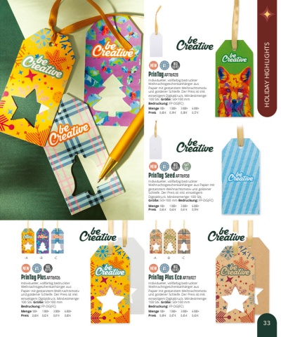 PrinTag Plus AP716926Individueller, vollfarbig bedruckter Weihnachtsgeschenkanh%u00e4nger aus Papier mit gestanztem Weihnachtsmotiv und goldener Schleife. Der Preis ist inkl. einseitigem Digitaldruck. Mindestmenge: 100 Stk. Gr%u00f6%u00dfe:50%u00d7100mmBedruckung:FP-DG(FC)Menge100+1 000+3 000+6 000+Preis0,44 %u20ac0,42 %u20ac0,41 %u20ac0,40 %u20acPrinTag Plus Eco AP716927Individueller, vollfarbig bedruckter Weihnachtsgeschenkanh%u00e4nger aus Papier mit gestanztem Weihnachtsmotiv und goldener Schleife. Der Preis ist inkl. einseitigem Digitaldruck. Mindestmenge: 100 Stk. Gr%u00f6%u00dfe:50%u00d7100mmBedruckung:FP-DG(FC)Menge100+1 000+3 000+6 000+Preis0,49 %u20ac0,47 %u20ac0,45 %u20ac0,43 %u20acPrinTag Seed AP716958Individueller, vollfarbig bedruckter Weihnachtsgeschenkanh%u00e4nger aus Papier mit gestanztem Weihnachtsmotiv und goldener Schleife. Der Preis ist inkl. einseitigem Digitaldruck. Mindestmenge: 100 Stk.Gr%u00f6%u00dfe:50%u00d7100mm Bedruckung:FP-DG(FC)Menge100+1 000+3 000+6 000+Preis0,65 %u20ac0,63 %u20ac0,61 %u20ac0,59 %u20acPrinTag AP716928Individueller, vollfarbig bedruckter Weihnachtsgeschenkanh%u00e4nger aus Papier mit gestanztem Weihnachtsmotiv und goldener Schleife. Der Preis ist inkl. einseitigem Digitaldruck. Mindestmenge: 100 Stk. Gr%u00f6%u00dfe:50%u00d7100mmBedruckung:FP-DG(FC)Menge100+1 000+3 000+6 000+Preis0,40 %u20ac0,39 %u20ac0,38 %u20ac0,37 %u20ac-A-B-C-A-B-CSEED33HOLIDAY HIGHLIGHTS