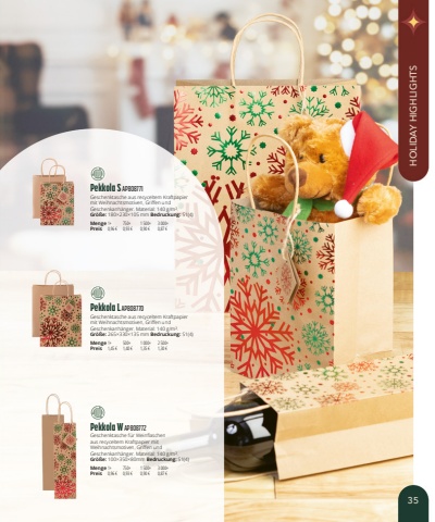 Pekkola S AP808771Geschenktasche aus recyceltem Kraftpapier mit Weihnachtsmotiven, Griffen und Geschenkanh%u00e4nger. Material: 140g/m%u00b2.Gr%u00f6%u00dfe:180%u00d7230%u00d7105mm Bedruckung:S1(4)Menge1+750+1 500+3 000+Preis0,96 %u20ac0,93 %u20ac0,90 %u20ac0,87 %u20acPekkola L AP808770Geschenktasche aus recyceltem Kraftpapier mit Weihnachtsmotiven, Griffen und Geschenkanh%u00e4nger. Material: 140g/m%u00b2.Gr%u00f6%u00dfe:265%u00d7330%u00d7135mm Bedruckung:S1(4)Menge1+500+1 000+2 500+Preis1,45 %u20ac1,40 %u20ac1,35 %u20ac1,30 %u20acPekkola W AP808772Geschenktasche f%u00fcr Weinflaschen aus recyceltem Kraftpapier mit Weihnachtsmotiven, Griffen und Geschenkanh%u00e4nger. Material: 140g/m%u00b2.Gr%u00f6%u00dfe:100%u00d7350%u00d780mm Bedruckung:S1(4)Menge1+750+1 500+3 000+Preis0,96 %u20ac0,93 %u20ac0,90 %u20ac0,87 %u20ac35HOLIDAY HIGHLIGHTS