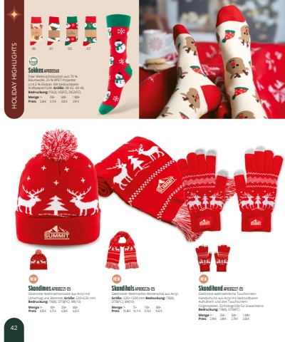 Skandimos AP800221-05Gestrickte Weihnachtsm%u00fctze aus Acryl mit Umschlag und Bommel. Gr%u00f6%u00dfe:220%u00d7220mmBedruckung:TB(8), DTB(FC), BR(10)Menge1+100+250+500+Preis4,92 %u20ac4,75 %u20ac4,58 %u20ac4,42 %u20acSkandihals AP800226-05Gestrickter Weihnachts-Winterschal aus Acryl.Gr%u00f6%u00dfe:220%u00d71500mm Bedruckung:TB(8), DTB(FC), BR(10)Menge1+75+150+300+Preis10,48 %u20ac10,11 %u20ac9,76 %u20ac9,42 %u20acSkandihand AP800227-05Gestrickte weihnachtliche TouchscreenHandschuhe aus Acryl mit bedruckbaren Aufn%u00e4hern und drei TouchscreenFingerspitzen. Einheitsgr%u00f6%u00dfe f%u00fcr Erwachsene.Bedruckung:TB(8), DTB(FC)Menge1+250+500+1 000+Preis2,98 %u20ac2,88 %u20ac2,78 %u20ac2,68 %u20acSokkex AP800568Paar Weihnachtssocken aus 73 % Baumwolle, 25 % RPET-Polyester und 2 % Elastan. Mit bedruckbarer Kraftpapierh%u00fclle. Gr%u00f6%u00dfe:38-42,43-46Bedruckung:P2(2), VS(FC), DG2(FC)Menge1+250+500+1 000+Preis3,24 %u20ac3,13 %u20ac3,02 %u20ac2,91 %u20ac-00-01-05-0742HOLIDAY HIGHLIGHTS