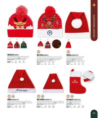 Mikku AP800164-05Klassische Weihnachtsm%u00fctze aus RPET-Filz mit wei%u00dfem Rand und Bommel. Gr%u00f6%u00dfe:315%u00d7440mmBedruckung:TB(8), DTB(FC), BR(10)Menge1+1 000+3 000+6 000+Preis0,58 %u20ac0,56 %u20ac0,54 %u20ac0,52 %u20acMini Mikku AP800165-05Klassische Weihnachtsm%u00fctze f%u00fcr Kinder aus RPET-Filz mit wei%u00dfem Rand und Bommel. Gr%u00f6%u00dfe:270%u00d7405mmBedruckung:TB(8), DTB(FC), BR(10)Menge1+1 000+3 000+6 000+Preis0,54 %u20ac0,52 %u20ac0,50 %u20ac0,48 %u20acBabbo AP800095-05Gestrickte Weihnachtsmannm%u00fctze aus Acryl mit wei%u00dfem Rand und Bommel. Gr%u00f6%u00dfe:230%u00d7390mmBedruckung:TB(8), DTB(FC), BR(10)Menge1+100+250+500+Preis4,66 %u20ac4,50 %u20ac4,34 %u20ac4,19 %u20acStrumpox AP800206-05Weihnachtsstrumpf aus RPETFilz. Gr%u00f6%u00dfe:275%u00d7405mmBedruckung:TB(8), DTB(FC)Menge1+750+1 500+3 000+Preis0,91 %u20ac0,88 %u20ac0,85 %u20ac0,82 %u20acNorrsken AP800175Gestrickte Weihnachtsm%u00fctze aus Acryl mit 6 LEDLeuchten (3 Leuchtmodi), B%u00fcndchen und Bommel. Mit Knopfzellenbatterie. Gr%u00f6%u00dfe:220%u00d7220mmBedruckung:TB(8), DTB(FC), BR(10)Menge1+100+250+500+Preis6,47 %u20ac6,24 %u20ac6,02 %u20ac5,81 %u20acMorkved AP800577Gestrickte weihnachtliche Winterm%u00fctze aus Acryl mit Bommel. Gr%u00f6%u00dfe:215%u00d7220mmBedruckung:TB(8), DTB(FC), BR(10)Menge1+100+250+500+Preis5,18 %u20ac5,00 %u20ac4,83 %u20ac4,66 %u20ac-A-B-C-A-B43HOLIDAY HIGHLIGHTS