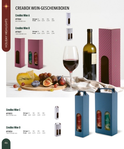 Menge50+100+250+500+Menge50+100+250+500+Menge50+100+250+500+Menge50+100+250+500+Preis4,40 %u20ac4,25 %u20ac4,10 %u20ac3,96 %u20acPreis6,34 %u20ac6,12 %u20ac5,91 %u20ac5,70 %u20acPreis4,66 %u20ac4,50 %u20ac4,34 %u20ac4,19 %u20acPreis6,60 %u20ac6,37 %u20ac6,15 %u20ac5,93 %u20acCreaBox Wine ACreaBox Wine BCreaBox Wine CCreaBox Wine DAP718661AP718677AP718933AP71893480%u00d7330%u00d780mm160%u00d7330%u00d780mm80%u00d7370%u00d780mm160%u00d7370%u00d780mmCREABOX WEIN-GESCHENKBOXEN46HOLIDAY HIGHLIGHTS