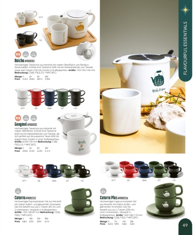 Baicha AP800183Hochwertiges Teeservice aus Keramik mit matter Oberfl%u00e4che und BambusServiertablett. Enth%u00e4lt eine Teekanne (500ml) mit Edelstahldeckel und Teesieb sowie zwei Tassen (150ml). Einzeln in Kraftpapierbox. Gr%u00f6%u00dfe:195%u00d7105%u00d7165mmBedruckung:C3(8), P3(2), E3, *:WPC3(FC)Menge1+25+50+100+Preis31,05 %u20ac29,96 %u20ac28,91 %u20ac27,90 %u20acGongmei AP800182Hochwertiges Teeservice aus Keramik mit matter Oberfl%u00e4che. Enth%u00e4lt eine Teekanne (430ml) mit Edelstahldeckel und Teesieb, die sich perfekt auf die passende Tasse (400ml) stapeln l%u00e4sst. Einzeln in einer Kraftpapierbox.Gr%u00f6%u00dfe:%u00f8160%u00d7150mm Bedruckung:C3(8), P3(2), E3, *:WPC3(FC)Menge1+25+50+100+Preis23,94 %u20ac23,10 %u20ac22,29 %u20ac21,51 %u20acCaturra AP800552Hochwertiges Espressotassen-Set aus Keramik mit matter Au%u00dfen- und gl%u00e4nzender Innenseite. Das Set besteht aus aus 2 Tassen (85ml.) und 2 Untertassen. Verpackt in Kraftpapierbox.Gr%u00f6%u00dfe:130%u00d7130%u00d787mm Bedruckung:C2(8), P3(2), *:WPC2(FC)Menge1+100+250+500+Preis9,06 %u20ac8,74 %u20ac8,43 %u20ac8,13 %u20acCaturra Plus AP800556Hochwertiges Cappuccinotassen-Set aus Keramik mit matter Au%u00dfen- und gl%u00e4nzender Innenseite. Das Set besteht aus aus 2 Tassen (200ml.) und 2 Untertassen. Verpackt in Kraftpapierbox. Gr%u00f6%u00dfe:160%u00d7160%u00d7110mmBedruckung:C2(8), P3(2), *:WPC2(FC)Menge1+75+150+300+Preis10,35 %u20ac9,99 %u20ac9,64 %u20ac9,30 %u20ac-10-10-01*-05-06A-07-01*-01*-05-06A-07-10-01*-05-06A-07-1049FLAVOURFUL ESSENTIALS